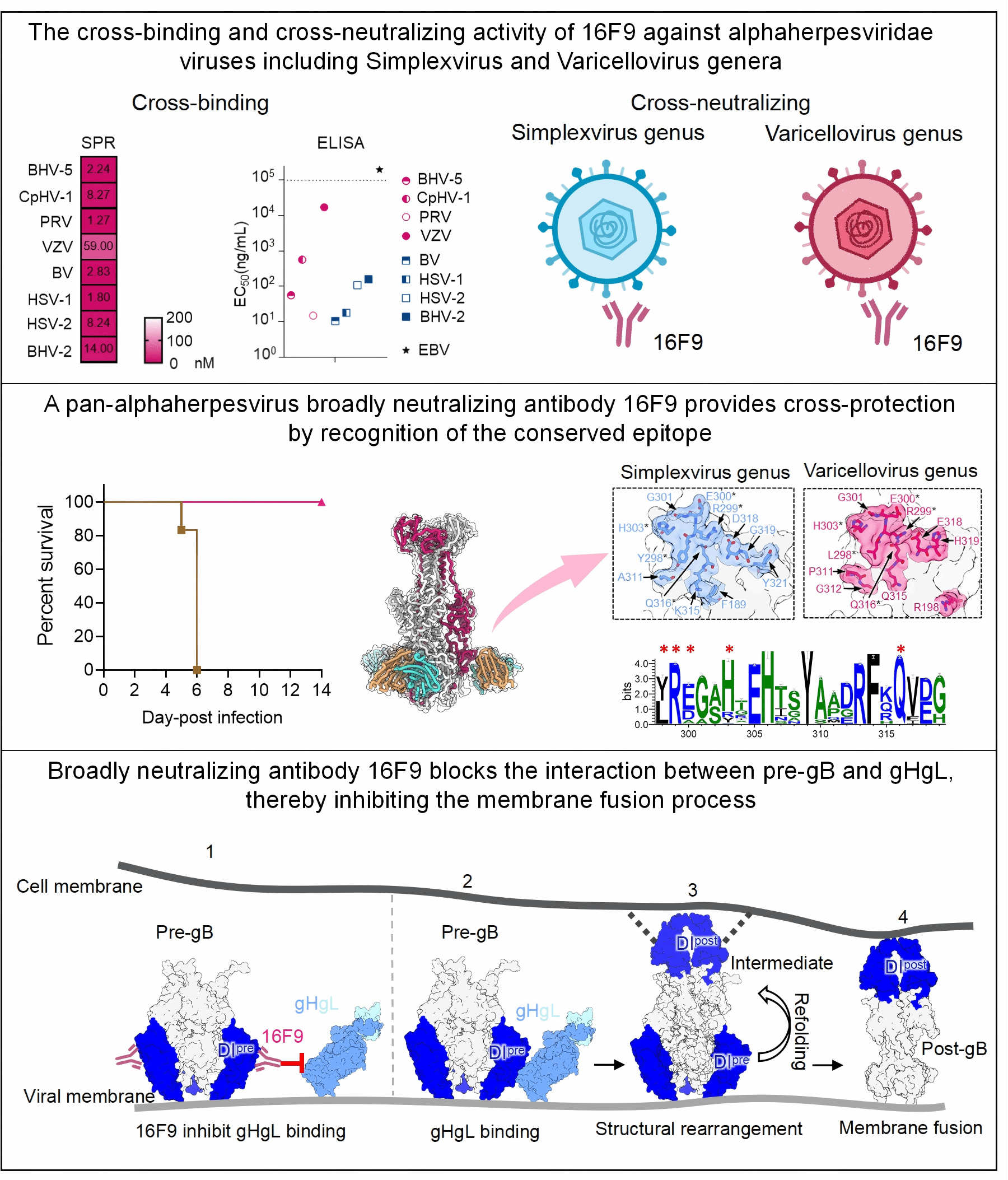 The global prevalence and disease burden of alphaherpesviruses infections, including human-infecting viruses such as HSV-1, HSV-2, and VZV, as well as animal-infecting viruses like PRV, BHV, CHV, and FHV, highlight the unmet need for more effective and universal antiviral strategies. However, there has been no significant progress in developing broad-spectrum interventions against herpesvirus. Here we report the identification of a broadly neutralizing antibody against alphaherpesviruses, 16F9, which targets the glycoprotein B (gB) of alphaherpesviruses and offers cross-protection against multiple viruses such as HSV-1, HSV-2, and PRV in mice. 16F9 demonstrated robust therapeutic efficacy in various female mouse models of herpesvirus diseases including PRV-induced viral encephalitis, HSV-1-induced viral encephalitis, viral keratitis, cutaneous herpes, and neonatal herpesvirus infections. High-resolution cryo-electron microscopy structures revealed that 16F9 binds a conserved site of vulnerability on Domain I of gB. The binding of 16F9 disrupts the interaction between pre-gB and gHgL complex, thereby preventing viral membrane fusion and blocking viral infection. This study provides a foundation for advancing antiviral strategies and underscores the potential of gB-targeted interventions for combating herpesvirus infections.