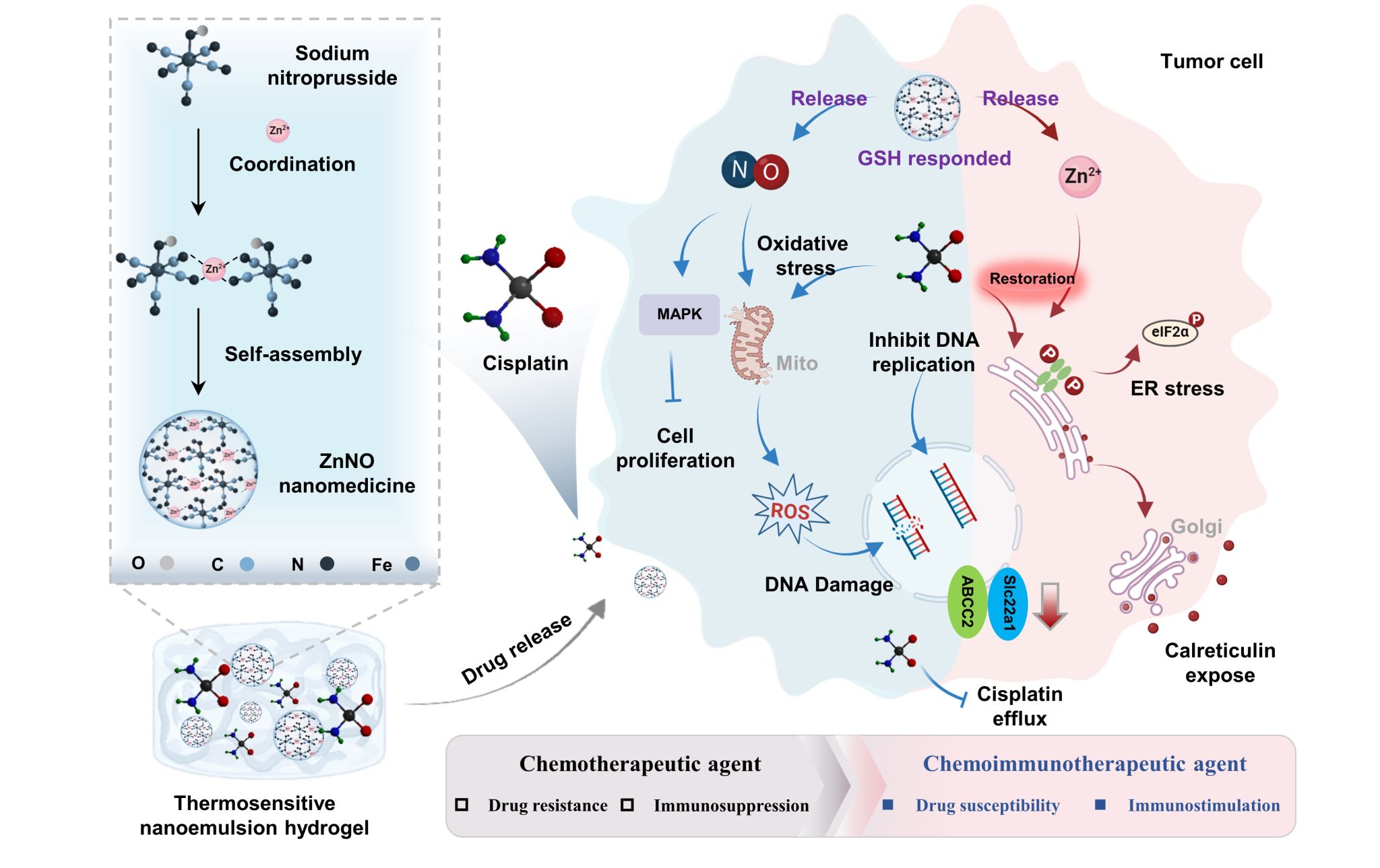 Hepatocellular carcinoma (HCC) is notoriously resistant to conventional chemotherapy and immunotherapy. This study presents a strategy that reprograms cisplatin into a chemoimmunotherapeutic agent by combining it with ZnNO, a fully active nanomedicine composed of sodium nitroprusside and zinc ions. Mechanistically, ZnNO enhances cisplatin chemosensitivity by depleting glutathione and releasing nitric oxide, while Zn²⁺ restores cisplatin-induced immunogenic cell death by activating endoplasmic reticulum stress via the PERK-eukaryotic translation initiation factor 2α (eIF2α) pathway. This dual modulation reactivates antigen presentation and promotes in situ antitumor immunity. Co-encapsulation of ZnNO and cisplatin in a thermosensitive nanoemulsion hydrogel enables transarterial chemoimmunoembolization, achieving sustained drug release, vascular embolization, and immune activation that downregulates drug resistance markers (MRP2 and Slc22a1), upregulates immune genes (CD8a and Hspa1a), and activates mitogen-activated protein kinase (MAPK) signaling. Overall, this work redefines cisplatin therapy by overcoming resistance and enhancing immunity, offering a translational strategy for HCC.