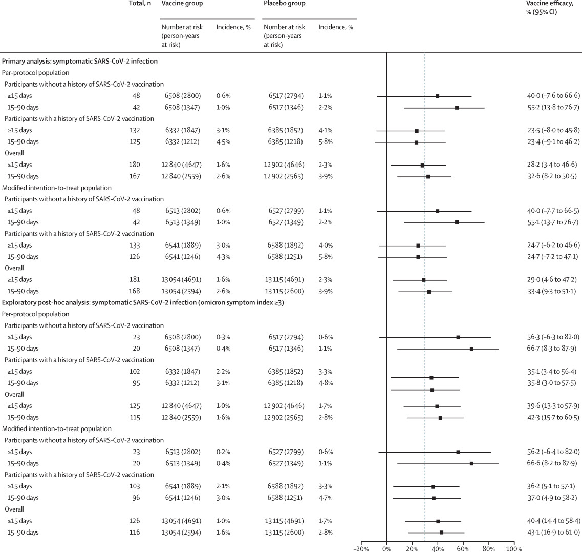 Between Dec 16, 2021, and May 31, 2022, 41 620 participants were screened for eligibility and 31 038 participants were enrolled and randomly assigned (15 517 in the vaccine group and 15 521 in the placebo group). 30 990 participants who received at least one dose (15 496 vaccine and 15 494 placebo) were included in the safety analysis. The results showed a favourable safety profile, with the most common local adverse reaction being rhinorrhoea (578 [3·7%] of 15 500 vaccine recipients and 546 [3·5%] of 15 490 placebo recipients) and the most common systemic reaction being headache (829 [5·3%] vaccine recipients and 797 [5·1%] placebo recipients). We found no differences in the incidences of adverse reactions between participants in the vaccine and placebo groups. No vaccination-related serious adverse events or deaths were observed. Among 30 290 participants who received two doses, 25 742 were included in the per-protocol efficacy analysis (12 840 vaccine and 12 902 placebo). The incidence of confirmed symptomatic SARS-CoV-2 infection caused by omicron variants regardless of immunisation history was 1·6% in the vaccine group and 2·3% in the placebo group, resulting in an overall vaccine efficacy of 28·2% (95% CI 3·4–46·6), with a median follow-up duration of 161 days.