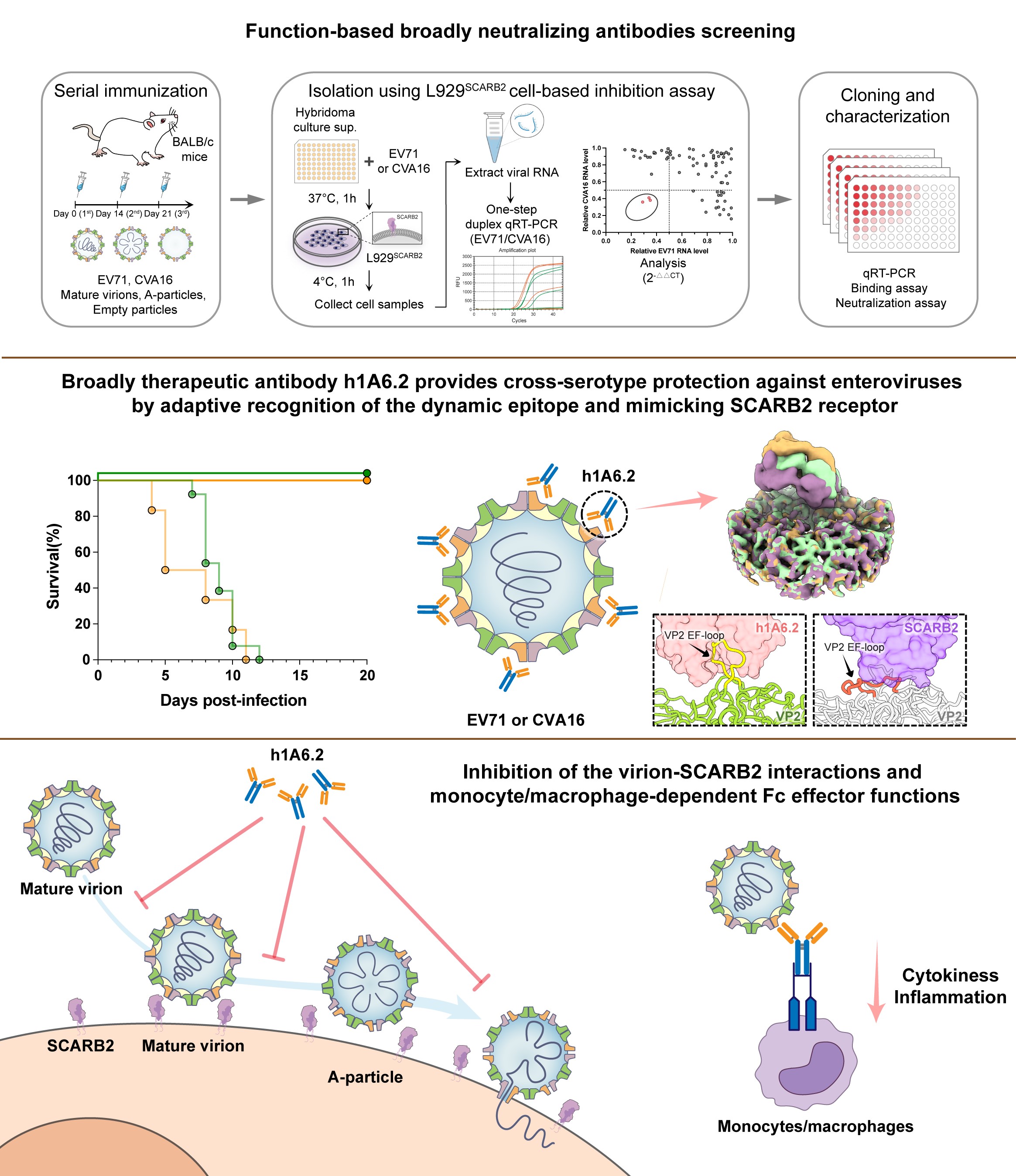 Enteroviruses contain multiple serotypes and can cause severe neurological complications. The intricate life cycle of enteroviruses involving dynamic virus–receptor interaction hampers the development of broad therapeutics and vaccines. Here, using function-based screening, we identify a broadly therapeutic antibody h1A6.2 that potently protects mice in lethal models of infection with both enterovirus A71 and coxsackievirus A16 through multiple mechanisms, including inhibition of the virion–SCARB2 interactions and monocyte/macrophage-dependent Fc effector functions. h1A6.2 mitigates inflammation and improves intramuscular mechanics, which are associated with diminished innate immune signalling and preserved tissue repair. Moreover, cryogenic electron microscopy structures delineate an adaptive binding of h1A6.2 to the flexible and dynamic nature of the VP2 EF loop with a binding angle mimicking the SCARB2 receptor. The coordinated binding mode results in efficient binding of h1A6.2 to all viral particle types and facilitates broad neutralization of enterovirus, therefore informing a promising target for the structure-guided design of pan-enterovirus vaccine.