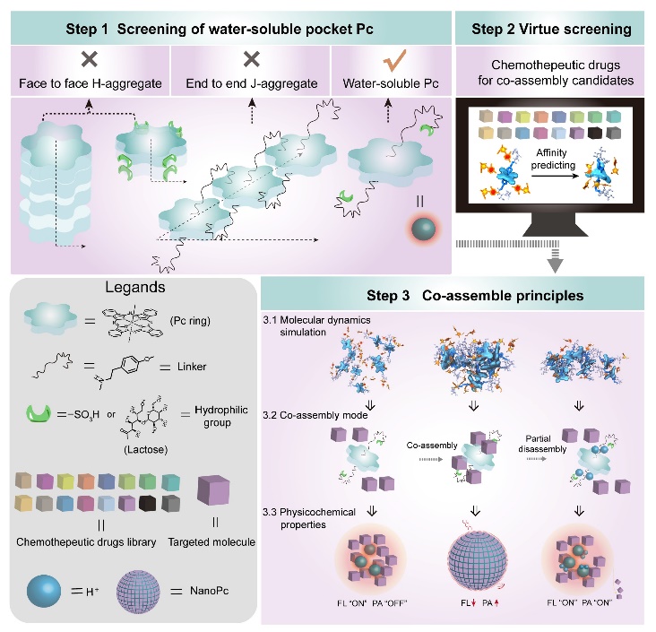 Coassemblies with tailored functions, such as drug loading, tissue targeting and releasing, therapeutic and/or imaging purposes, and so on, have been widely studied and applied in biomedicine. De novo design of these coassemblies hinges on an integrated approach involving synergy between various design strategies, ranging from structure screening of combinations of “phthalocyanine-chemotherapeutic drug” molecules for molecular scaffolds, exploration of related fabrication principles to verification of intended activity of specific designs. Here, we propose an integrated approach combining computation and experiments to design from scratch coassembled nanoparticles. This nanocoassembly, termed NanoPC here, consists of phthalocyanine-based scaffolds hosting chemotherapeutic drugs, aimed at hypersensitive chemotherapy guided by photoimaging for targeting tumors. Our design starts from the selection of phthalocyanine derivatives that are not aggregation-prone, followed by computational screening of coassembled molecules covering various categories of chemotherapy drugs. To facilitate an efficient and accurate assessment of coassembly capabilities, we utilize small systems as surrogates to enable free-energy calculations at all-atom levels facilitated with enhanced sampling and statistical mechanics for efficient and accurate evaluation of coassembly ability. The final top NanoPC candidate, comprised of phthalocyanine PcL and cytarabine (CYT), can greatly increase the fluorescence intensity ratio of tumor/liver by 21.5 times and achieve higher antitumor efficiency in a pH-dependent manner. Therefore, the designing approach proposed here has a potential pattern, which can provide ideas and references for the design and development of coassembled nanodrugs with tailored functions and applications in biomedicine.