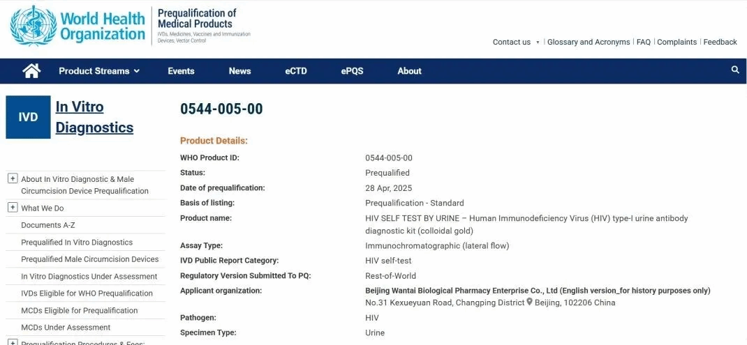 It is the world's first HIV urine self-test kit to obtain WHO PQ and is also the third HIV testing product jointly developed by both parties to obtain the certification.
