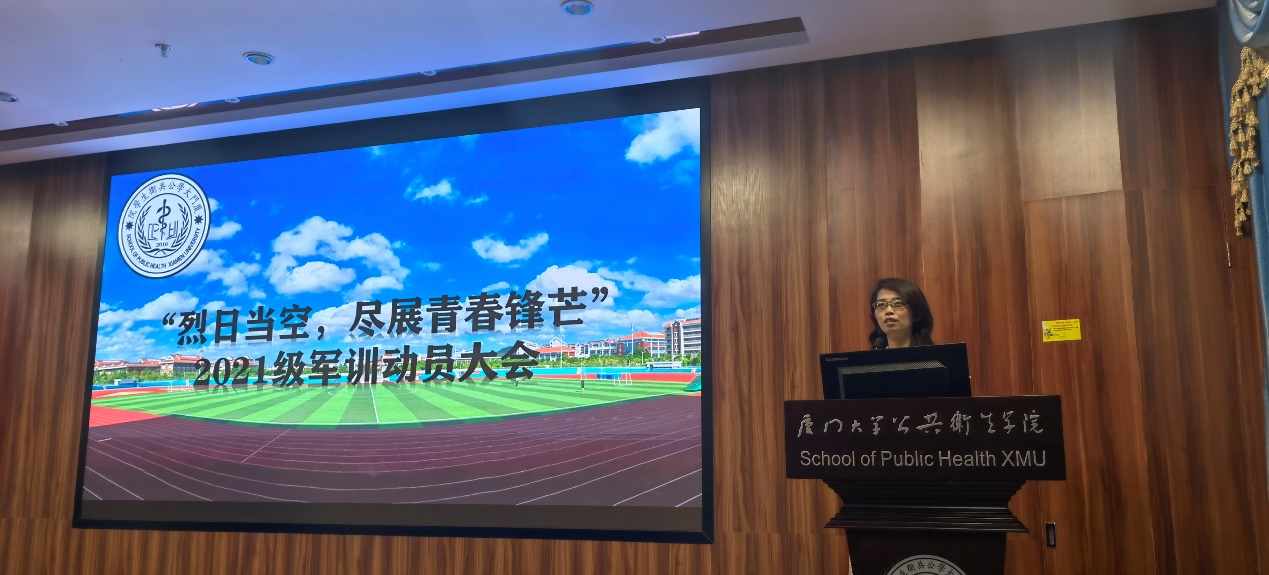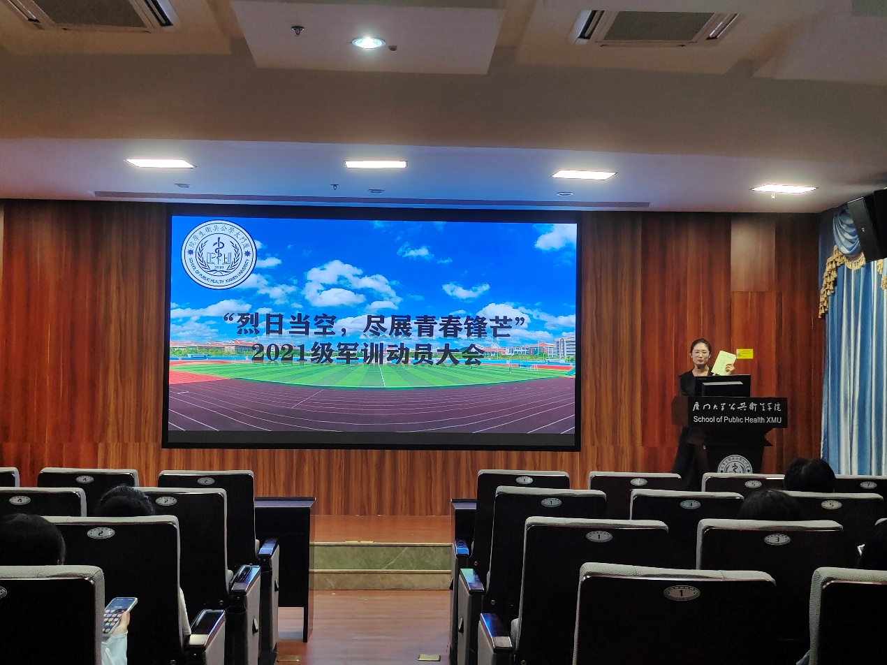2022年7月12日上午,公共卫生学院2021级本科生“烈日当空,尽展青春锋芒”军训动员大会在曾宪梓楼101报告厅举行,学院党委副书记、军训教导员庄曦老师,2021级本科生辅导员、军训指导员戴秀芬老师出席此次会议。