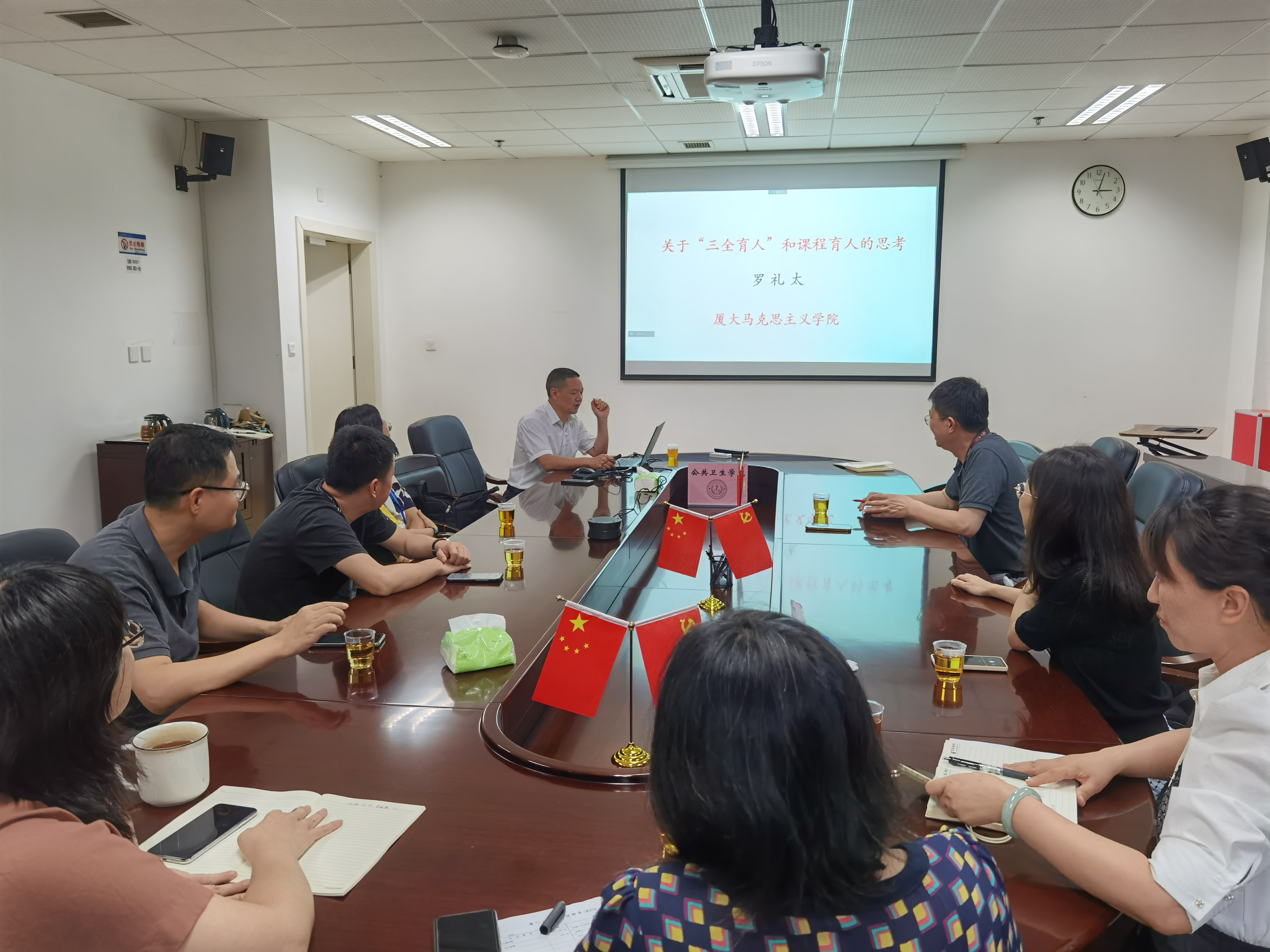 罗礼太老师结合自身从教经历,从新时代高校思政课教师的使命,新时代高校“三全育人”的内涵,科研育人的目标、思路和举措,“三全育人”和科研育人协力同行四个方面与老师们分享了他在思想政治教育工作中的体会和感悟。他强调,新时代高校“三全育人”核心是“人”,关键是“全”,基础是“合”,要建设课程育人、科研育人、实践育人、文化育人、网络育人、心理育人、管理育人、服务育人、资助育人、组织育人的“十大育人体系”。公共卫生学院课程思政可结合专业特色,要“一把手”统揽课程育人全局,“一体化”构建课程育人体系,“一盘棋”攻克课程育人重点难点,“一公里”打通课程育人盲点断点,“一把尺”衡量课程育人工作成效。要使教育教学更有温度、思想引领更有力度、立德树人更有效度,切实提高工作亲和力和针对性,着力培养德智体美全面发展的社会主义建设者和接班人,着力培养担当民族复兴大任的时代新人。