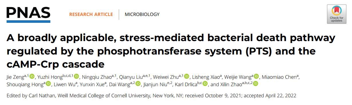 近日,我院赵西林课题组发现各种不同细菌死亡方式之间存在一条普适性共享通路并阐明了其分子机制,相关研究成果以“A broadly applicable, stress-mediated bacterial death pathway regulated by the phosphotransferase system (PTS) and the cAMP-Crp cascade”为题在线发表于《美国科学院院刊》(PNAS)。