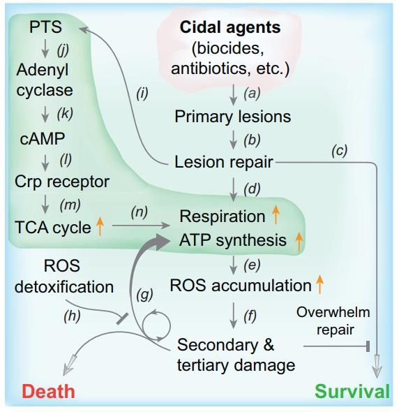 赵西林教授课题组成功地建立了一种利用筛选鉴定抗死突变体(Anti-death mutant)的方法,以“抗死”为切入点来探究死亡发生的机制,巧妙地间接性反推出哪些生命活动参与了死亡过程,从而攻克了技术瓶颈,首次证明了各种不同诱因介导的死亡共享了一条普适性(Universal )调控通路。课题组首先选用烈性消毒杀菌剂苯酚来排除耐药突变体筛选对抗死突变体富集的干扰,成功获得了抗死(耐受)突变体,然后惊奇地发现这个用单一杀菌剂苯酚富集而获得的突变体竟然对后续检测的所有消毒剂、抗生素及环境杀菌因素等均显示出了超广谱的死亡耐受表型,证明细菌死亡存在一条普适性共享通路。进一步研究揭示出PTS碳水化合物磷酸转移转运体系偶联cAMP-Crp信号转导系统,通过调控下游碳通量、呼吸链代谢、ATP合成及活性氧积累而参与共享死亡通路的分子调控。该研究创建了一个新颖独到的细菌死亡机制研究平台,为进一步深入理解细胞死亡的分子机理开拓了新思路,相关成果对微生物、动植物和人源的细胞死亡可能都具有普遍性指导价值,并为有效杀灭病原细菌、延长益生菌及工业生产菌株抗逆寿命提供了新靶标,还为目前广为流行的整合人-动植物-环境为一体的同一健康(One Health)理念提供了分子水平的实验证据支持。
