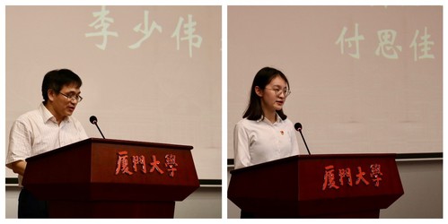 获奖教师代表李少伟教授、学生代表2019级硕士研究生付思佳先后上台发言。李少伟教授用“有爱、有心、有情”三个词概括了学院博爱、和谐和风清气正的氛围环境,承诺未来将用更多的科研成果回报学院。付思佳则从满足感、获得感和成就感三个方面总结了在学院三年的幸福求学时光,表示自己将继续肩负公卫人的时代使命,乘风破浪,勇往直前。
