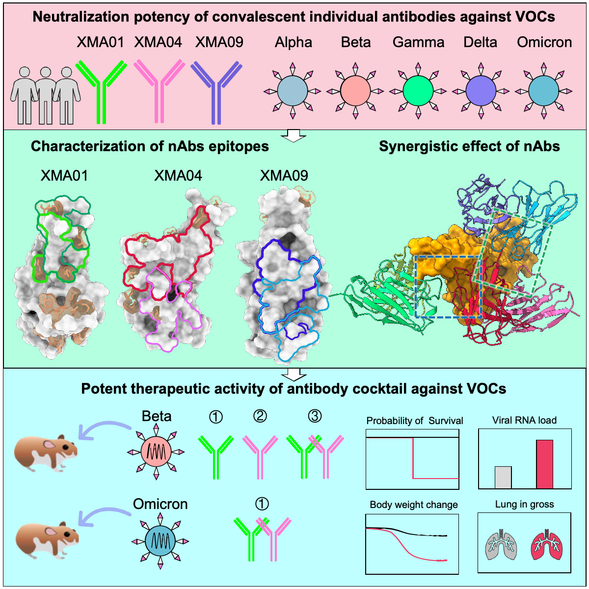 夏宁邵教授团队在新冠疫情暴发后快速投入到新冠中和抗体及其广谱中和表位鉴定的科研攻关中。在疫情初期,研究团队基于小鼠序贯免疫策略,筛选获得两株能够抵御新冠病毒变异株的广谱中和抗体,并鉴定了其识别的冠状病毒Sarbe亚属隐匿性广谱中和表位(Nat Commun. 2021,12(1):5652)。随后,研究团队和深圳三院合作,证实疫苗能够诱导出有效对抗Omicron变异株的广谱中和抗体,并且靶向了一类受体结合基序(RBM)附近的公共的保守表位(Cell Res. 2022,32(5):491-494)。在前期研究的基础上,研究团队开始探索如何进一步发挥中和抗体的保护或治疗作用。相较于单一抗体,抗体组合的鸡尾酒疗法具有更强的中和效力及突变耐受能力。在该研究中,研究团队首次发现RBD上存在的三个广谱中和表位能够同时被三株中和抗体(XMA01、XMA04及XMA09)所识别,并且在动物模型上验证了相关抗体鸡尾酒疗法的高效治疗效果。该抗体组合的发现与鉴定对应对未来潜在的新变异株以及其他冠状病毒大流行方面具有重要的储备价值,同时有助于指导新一代通用新冠疫苗的研发。
