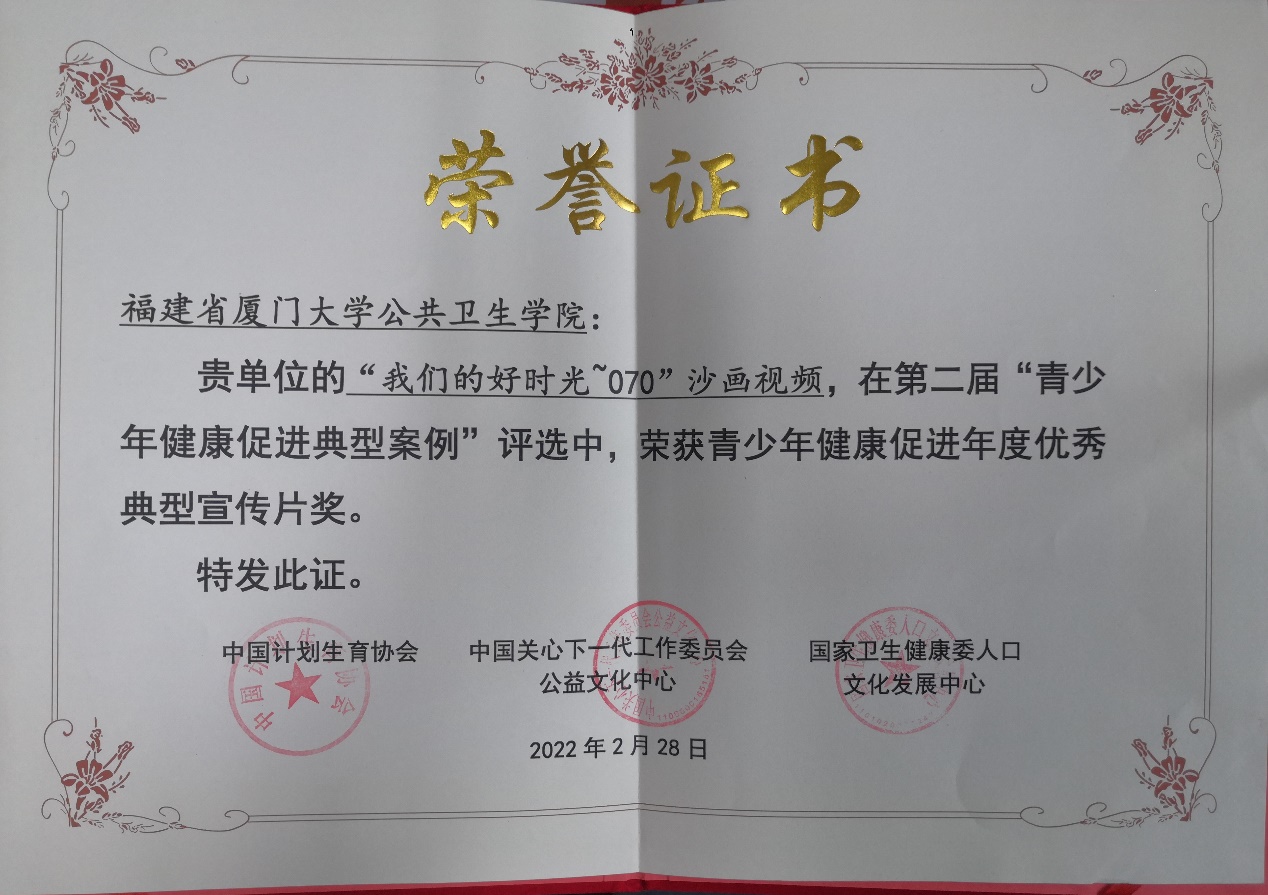 为贯彻落实《“健康中国2030”规划纲要》,助力青少年健康促进与发展,进一步推动健康中国行动中健康知识普及行动的开展,中国计划生育协会、中国关心下一代工作委员会公益文化中心、国家卫生健康委人口文化发展中心联合主办了第二届“青少年健康促进典型案例”征集评选活动。由我院教师江宜珍副教授指导,褚美洁、江努尔·哈布勒、盛红梅、刘桂杉4位学生完成的作品《“我们的好时光~070”沙画视频》,经过初审、网络评选、专家评审等环节的激烈角逐,荣获青少年健康促进年度优秀典型宣传片奖。据悉,本次全国共评选出10个青少年健康促进年度优秀典型宣传片奖。