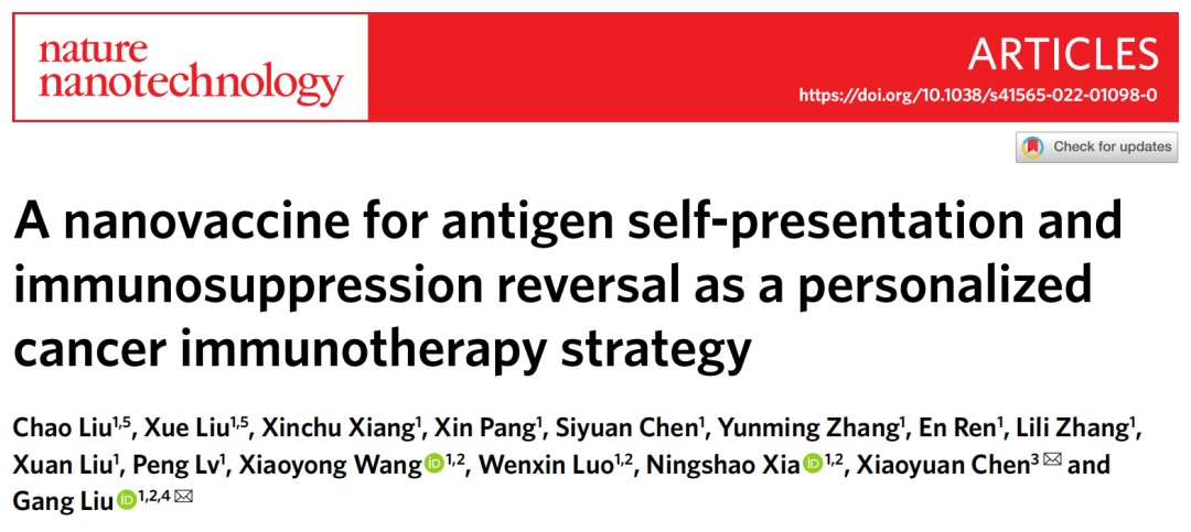 4月11日,我院分子影像中心刘刚教授团队在国际顶级学术期刊Nature Nanotechnology上发表题为“A nanovaccine for antigen self-presentation and immunosuppression reversal as a personalized cancer immunotherapy strategy”的研究论文。该研究发现了共刺激信号对肿瘤免疫耐受中T细胞功能重塑的重要机制,并首次报道了一种既可直接激活初始T细胞,又可活化耗竭性T细胞的肿瘤疫苗策略,为个性化肿瘤疫苗研发提供了理论依据和创新方法。同时,Nature Nanotechnology配发专题亮点评述文章“Boosting dendritic cell nanovaccines”,评价这项工作突破了现有树突状细胞疫苗的认知框架,推动纳米疫苗免疫学领域向前迈出一大步。