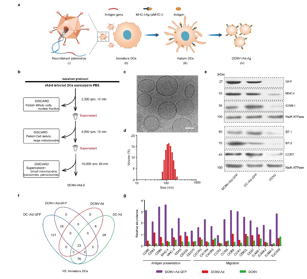 在这项工作中,刘刚教授团队基于课题组创建的细胞膜仿生定向表达展示技术(Adv Mater 2019, Angew Chem 2018, PNAS 2015),将工程化树突状细胞(DCs)膜作为一种天然的免疫活化信号转导载体,调控DCs表面共刺激分子表达,构建了ASPIRE纳米囊泡疫苗平台,通过多重共刺激信号递送实现多维度的抗肿瘤免疫活化。制备的ASPIRE疫苗体系,因为其来源于DC母细胞表面与归巢效应相关的功能性趋化因子和粘附分子,以及可控的纳米尺寸,所以能迅速穿越组织间隙,实现在淋巴结的富集,并介导CD8+T细胞主导的抗原特异性免疫应答。有别于传统的疫苗递呈方式,研究中所制备的疫苗可以直接将表位递呈至T细胞,且不需要体内的抗原递呈细胞的参与。这种抗原递呈模式很大程度提高了免疫活化的效率。该疫苗即使在实体瘤的治疗中也发挥了非常强劲的效果,实现对实体肿瘤的彻底清除,并诱导长效的免疫记忆,相关授权专利(ZL 202010070724.9)已完成企业技术转移,正在开展临床转化研究。