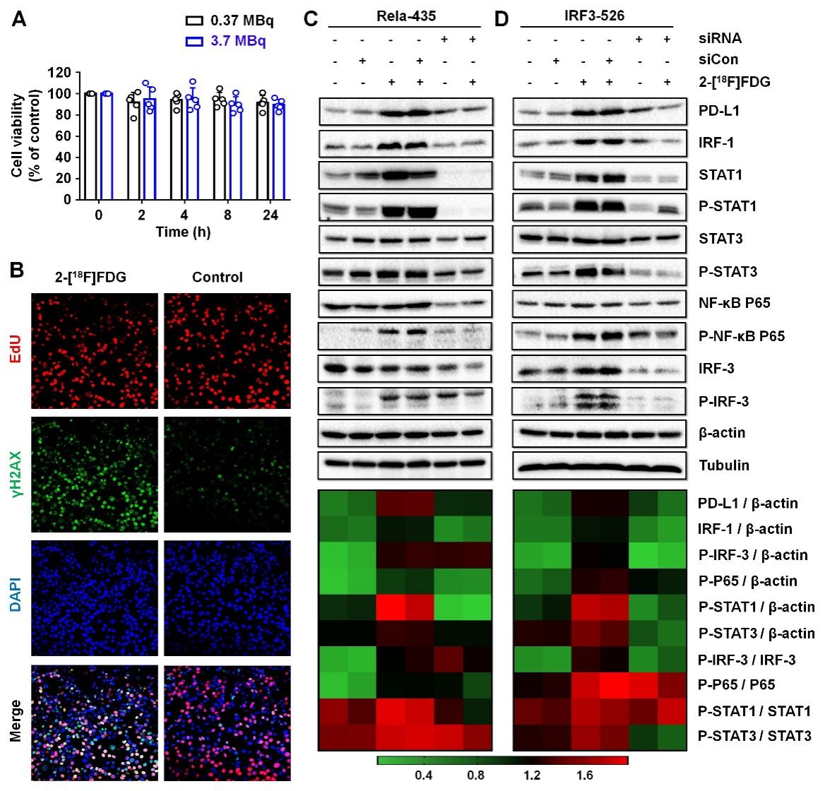 基于该发现,该研究团队首次将2-[18F]FDG与anti-PD-L1抗体联合使用,用于放射性配体与免疫检查点抑制剂联合治疗肿瘤。首先,研究人员通过流式细胞术,免疫荧光实验,RT-qPCR等一系列体外实验验证了多种肿瘤细胞表面的PD-L1表达水平在经过2-[18F]FDG刺激后均明显上调,且通过转录组学研究揭示了在该过程中多个与PD-L1相关基因的上调以及一些可能的信号通路改变。通过克隆聚集实验及检测DNA损伤发现即使较高剂量2-[18F]FDG的参与也不会造成大多数肿瘤细胞的死亡,但会有明显的DNA损伤及损伤后修复的过程发生。为探索2-[18F]FDG与PD-L1上调的内在关联,该团队通过western blot研究证明了NF-κB和 IRF3信号通路的激活,并且验证了DNA损伤后修复的过程可以通过激活NF-κB和 IRF3信号进而上调PD-L1的表达。除此之外,该研究还证明了DNA损伤后PD-L1的上调也通过STAT1/3-IRF1通路介导。