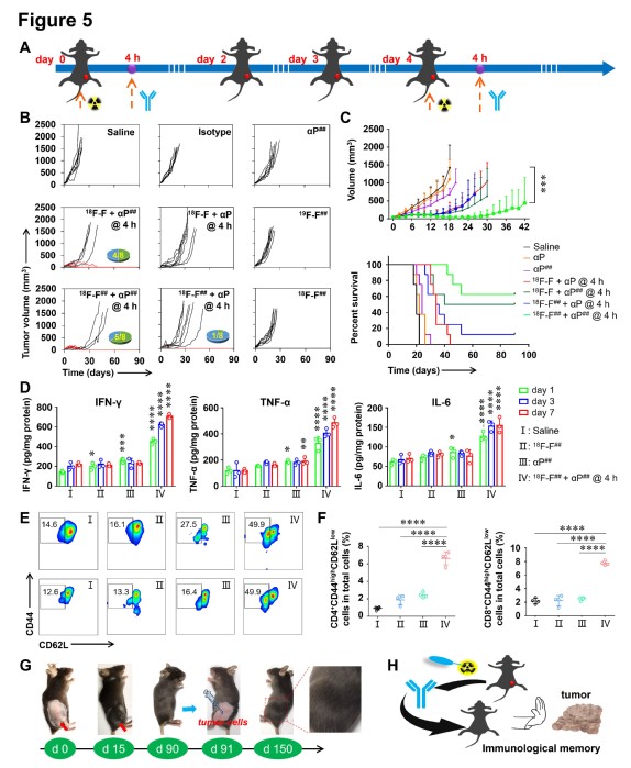 既然2-[18F]FDG可以造成肿瘤细胞表面PD-L1表达的改变,那么是否可以增加anti-PD-L1抗体的摄取?该团队通过PET显像,免疫组化,流式细胞术等一系列体内外实验验证了2-[18F]FDG上调的PD-L1表达可以增加PD-L1抗体在肿瘤部位的摄取。基于此,将示踪剂2-[18F]FDG与anti-PD-L1抗体联合进行免疫治疗将有可能增强抗PD-L1免疫治疗的效果。研究结果表明,在合适的剂量(18.5 MBq 2-[18F]FDG)和4小时时间窗的条件下,该联合策略可以对MC38肿瘤鼠产生明显的肿瘤抑制效果,且有50%以上的肿瘤在监测周期内消失且在对侧接种相同类型的肿瘤也无明显生长,监测至150天内均无复发的迹象,证明了该联合治疗策略不仅有强大的抗肿瘤效果,且可以产生免疫记忆,防止肿瘤的复发。治疗过程中对肿瘤微环境进行检测,发现在联合治疗组中,CD8+杀伤性T细胞,CD4+辅助杀伤性T细胞的比例显著增加,而FOXP3+的抑制性T细胞比例显著降低。此外M1型巨噬细胞和树突状细胞的比例相对生理盐水组也有明显的增加,而抑制性的M2型巨噬细胞和髓源性抑制细胞的比例明显降低。证明了该联合治疗方式重塑了肿瘤微环境,使其由“冷”变“热”,同时增强了低免疫原性肿瘤的敏感性,提高了其对PD-L1抗体治疗的响应率。