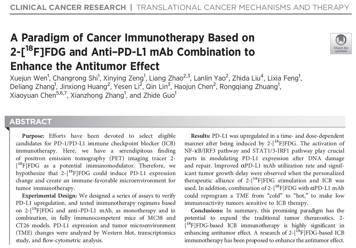 近日,我院郭志德老师、张现忠教授和新加坡国立大学陈小元教授在Clinical Cancer Research上发表了题为“A paradigm of cancer immunotherapy based on 2-[18F]FDG and anti-PD-L1 mAb combination to enhance the anti-tumor effect”的研究性论文,报道了一种基于2-[18F]FDG和anti-PD-L1抗体联合的癌症免疫治疗新范式。作为临床应用最广泛的PET示踪剂,全球每年有数千万例的肿瘤患者需要用到2-[18F]FDG的PET显像进行辅助诊断。虽然,2-[18F]FDG-PET成像在肿瘤检测、疗效评估等方面中发挥着突出的作用,但作为免疫调节剂调节免疫检查点受体表达、增强免疫治疗效果的能力从未被考虑。我们在研究中偶然发现,2-[18F]FDG作为一种潜在的免疫调节剂,可以诱导肿瘤细胞表面PD-L1表达的改变,为肿瘤免疫治疗创造更有利的免疫微环境。如能将其用于癌症的免疫联合治疗,将使得更多的癌症患者受益。