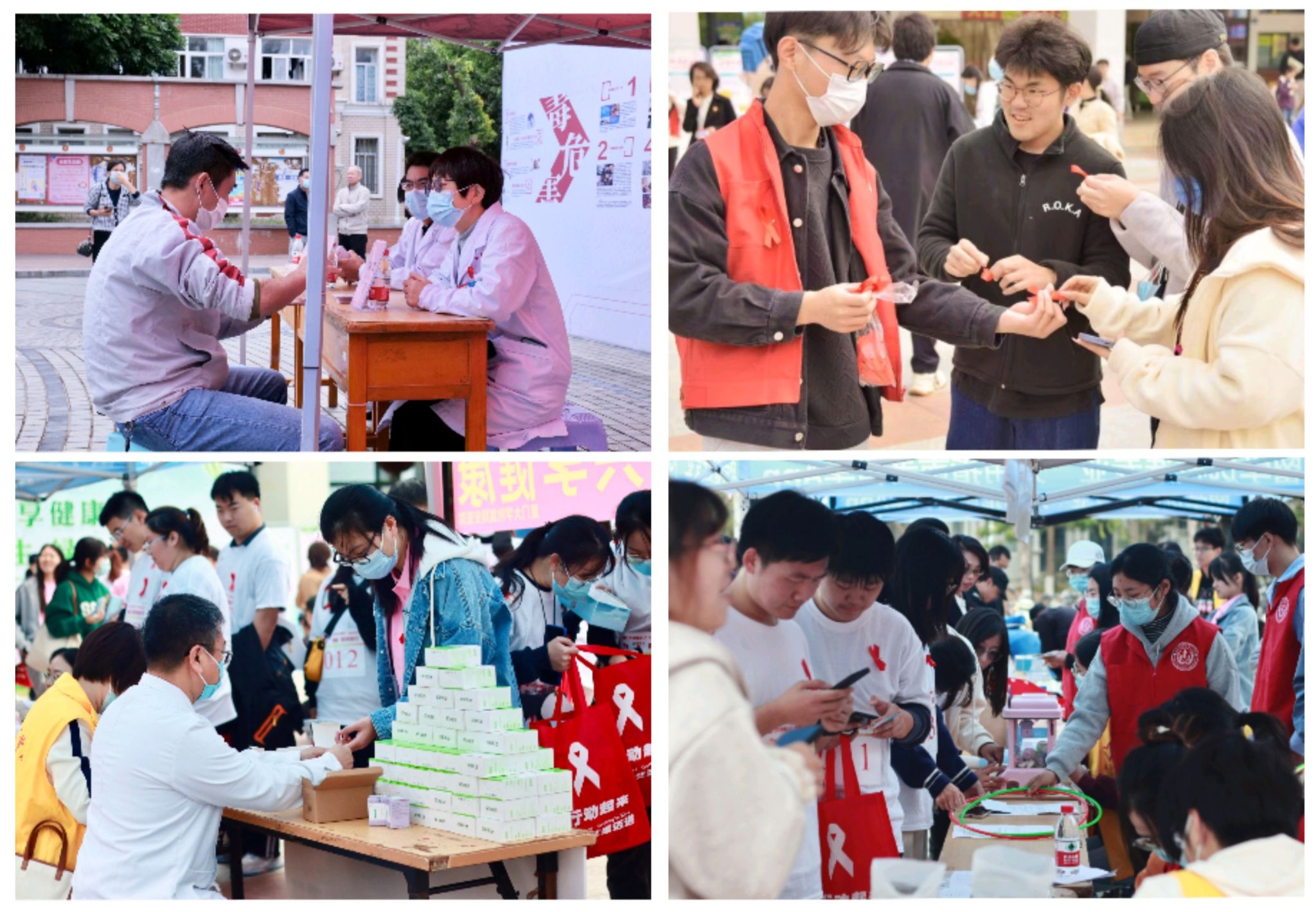 在思明校区三家村和翔安校区丰庭餐厅前广场,来自红丝带先锋党支部、公共卫生学院和艺术学院的志愿者们为参加活动的师生佩戴红丝带、发放宣传资料,引导大家参与有奖知识竞答和“防艾有我”签名活动。现场还展示了世界艾滋病日主题创意作品、禁毒知识宣传海报,安排了多款趣味小游戏,以寓教于乐的方式,帮助大学生加强对艾滋病防治和禁毒戒毒知识的了解。来自厦门大学医院和厦门大学附属翔安医院的医师们现场坐诊,为师生提供免费健康咨询、乙肝抗原义诊和皮肤科相关知识讲解。保卫处对40余种常见毒品进行实物展示和科普,倡导广大师生“远离毒品,健康生活”。
