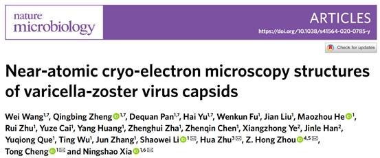 9月7日,夏宁邵教授团队在《自然》子刊《自然•微生物学》(Nature Microbiology)上发表题为“Near-atomic cryo-electron microscopy structures of varicella-zoster virus capsids”的研究论文。该研究首次揭示了疱疹病毒α家族的水痘-带状疱疹病毒(VZV)不同类型核衣壳的近原子分辨率结构,阐明了VZV核衣壳不同组成蛋白的相互作用网络与衣壳装配机制,可为进一步开展新型载体疫苗设计及抗病毒药物等研究提供重要支持。