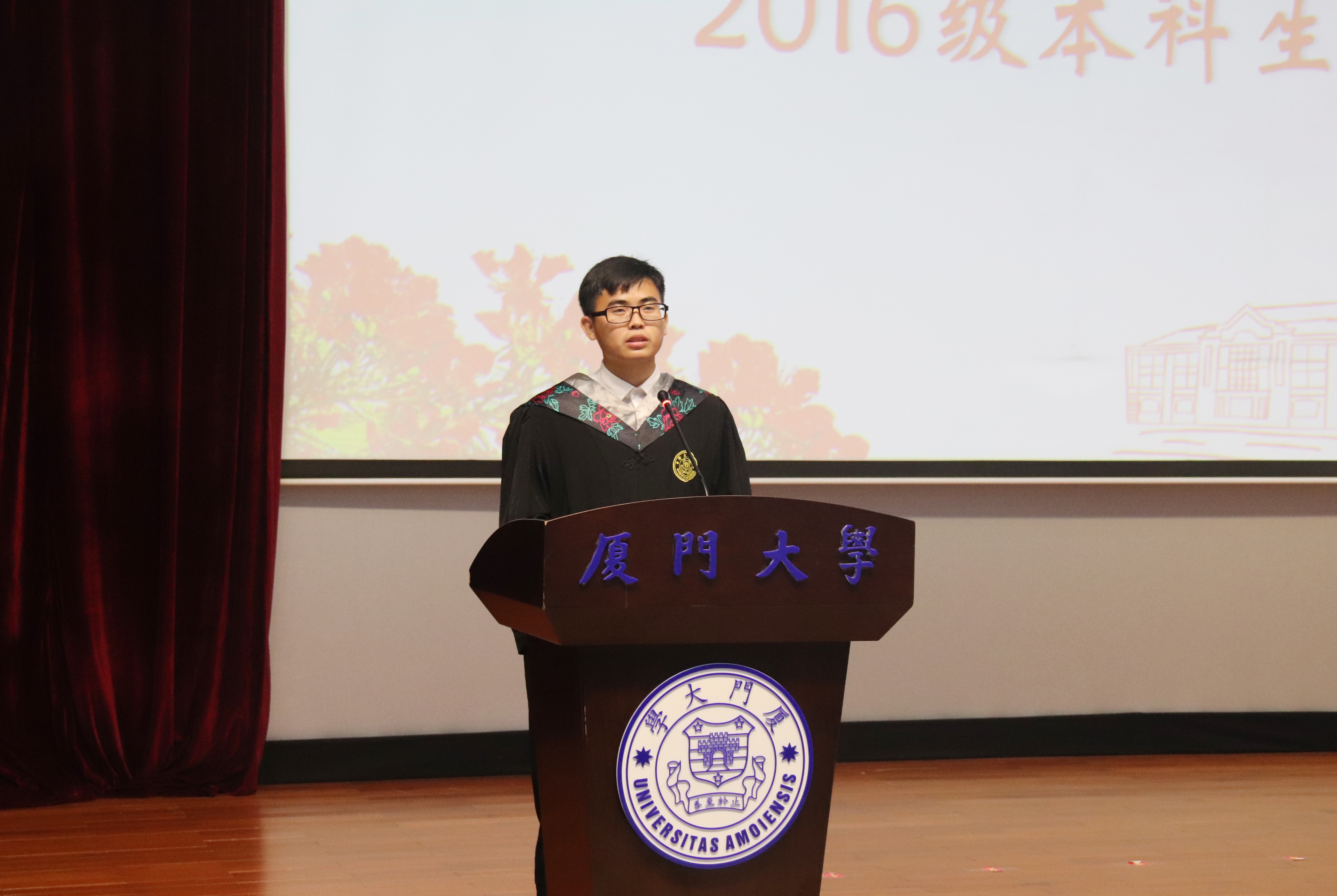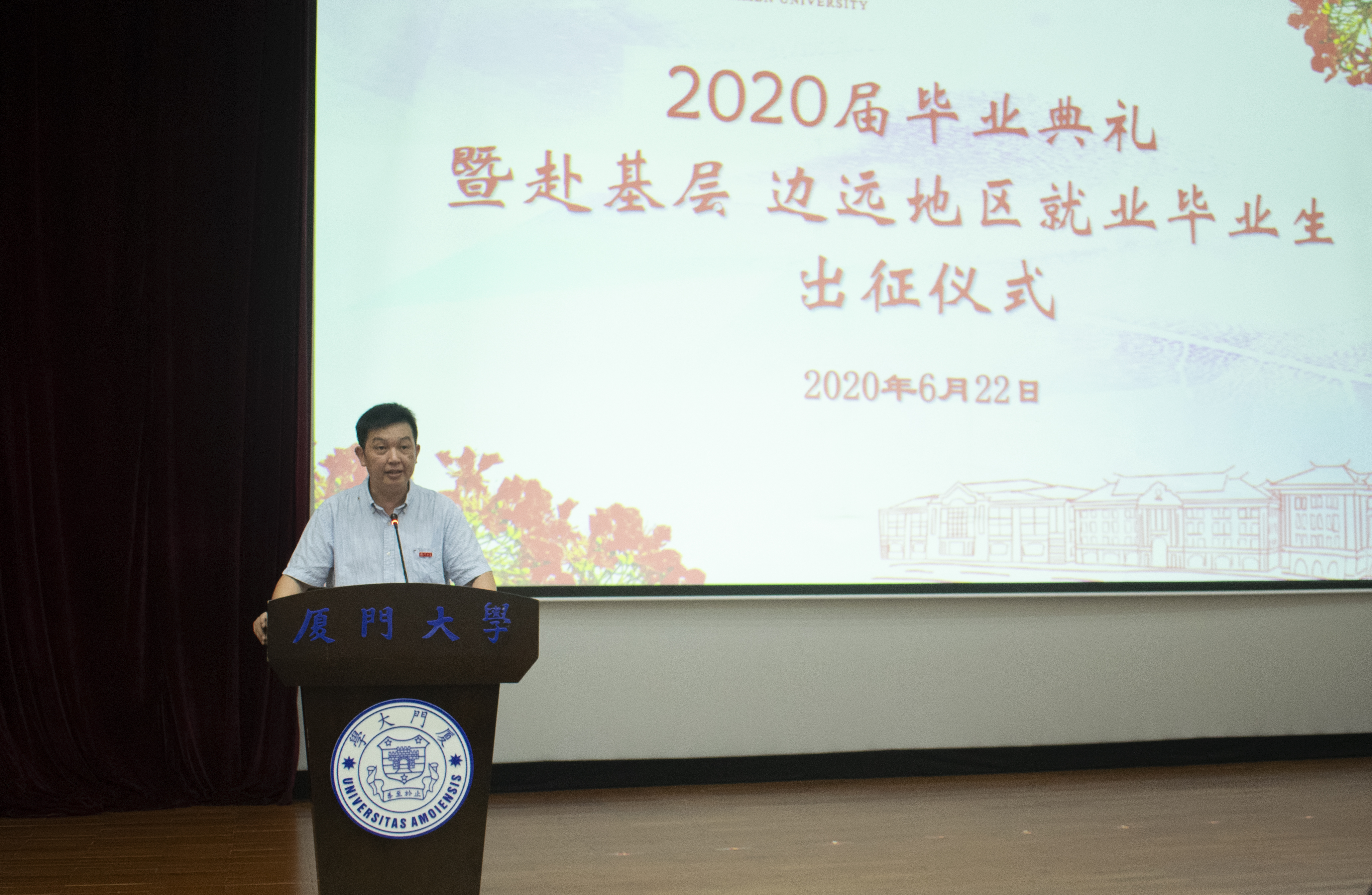 典礼在庄严的国歌声中拉开帷幕。院长夏宁邵教授在致辞中回顾了毕业班同学们在校学习生活期间的良好表现,肯定同学们是学院发展的见证者,更是推动学院发展的参与者、贡献者。抗击疫情是这届毕业生的最后一课,夏院长对同学们以投入科研攻关、科普防控知识、参加志愿服务等形式上好大学的最后一课,给予了高度评价,称赞同学们以自己的坚守和信念,让自己的毕业生活显得格外不一样,更加有格局、有意义。他希望同学们在今后的岗位上干一行、爱一行、精一行,继续为健康中国建设添砖加瓦。最后,他祝愿同学们一帆风顺、前程似锦!并不忘叮嘱大家,明年是厦门大学百年华诞,也是学院成立十周年,欢迎同学们回家看看!