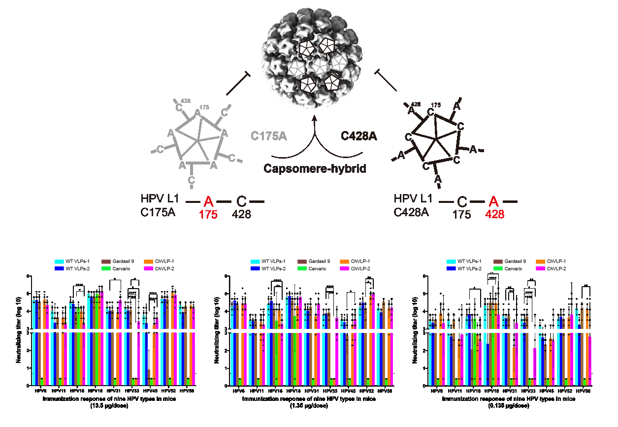 该研究首先将HPV L1蛋白上对VLP组装非常关键的175位和428位半胱氨酸分别突变为丙氨酸(C175A、C428A),结果显示单点突变后的L1五聚体无法组装形成VLP,而两个不同型别的L1-C175A五聚体和L1-C428A五聚体能杂合组装形成单一的杂合病毒样颗粒(chVLP),且最适的杂合组装化学计量比为1:1;冷冻电镜解析结果显示chVLP的颗粒形态与野生型VLP类似,均为T=7的二十面体对称结构;有趣的是,该杂合组装方式是一种不限HPV型别的随机组装,实验测试了2~9种不同型别的L1五聚体均可杂合组装成chVLP,理论上一个chVLP中能容纳72种不同型别的L1五聚体。使用单克隆抗体分析颗粒抗原性发现,chVLP在保留了大部分型特异性表位的同时也产生了不同于野生型的新表位。进一步使用该杂合组装策略将9种型别(HPV 6、11、16、18、31、33、45、52、58)的L1五聚体装配至单颗粒中形成9型杂合病毒样颗粒(nona-type chVLP),在小鼠模型中能诱导出与Gardasil 9®相当的针对9种型别的高水平的中和抗体滴度。研究者提出,如果将该杂合组装技术与团队前期设计的三型嵌合颗粒技术(tri-type chimeric VLP)相结合,理论上可以通过在单一chVLP上簇集216种型别的HPV中和表位而做成pan-HPV广谱疫苗,可涵盖目前鉴定的约200种型别的HPV。该项技术可有望应用于针对高变病原体和携带新抗原肿瘤细胞的疫苗设计以及可控的药物递送载体。