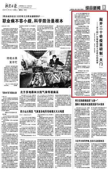 4月28日,《科技日报》第三版以“敲开二十价疫苗研制‘大门’——首个国产宫颈癌疫苗上市背后的故事”为题,《科技日报》公众号以“首个国产宫颈癌疫苗上市,二十价疫苗研制也有眉目了!”为题,同步推出我校和养生堂万泰研制的首个国产宫颈癌疫苗背后故事的报道。