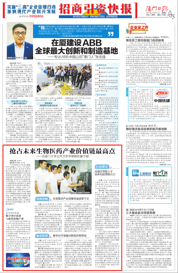 夏宁邵:围绕新型药物、数字诊疗装备和信息技术而形成的生物医药与健康产业,未来将是万亿规模的大产业。新型药物和数字诊疗装备是当前和未来引领厦门生物医药产业高质量发展的两个重点领域,我市今后可瞄准高技术含量、高附加值、高成长性的细分领域进行重点培育。
