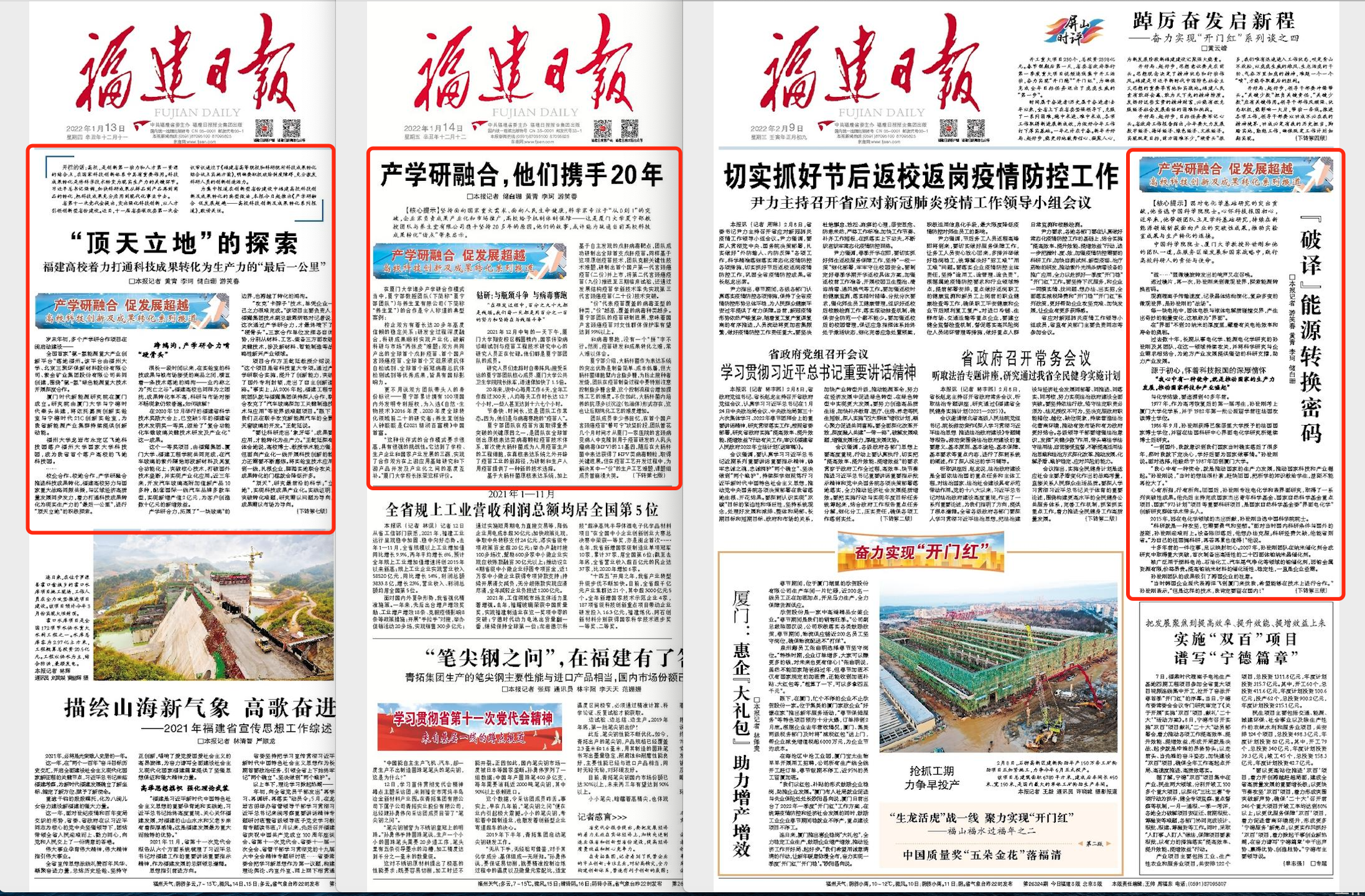 近期,福建日报在头版推出《产学研融合促发展超越》系列报道,深度报道福建省打造产学研融合促发展超越,高校科技创新及成果转化有关情况。其中,我校科技创新亮点及成果转化情况三次“亮相”。