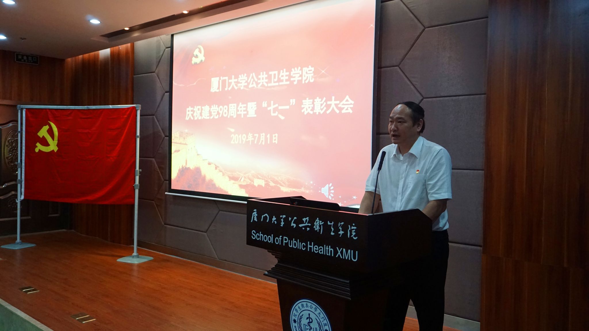 7月1日,公共卫生学院党委在曾宪梓楼101报告厅举行“七一”表彰大会,庆祝中国共产党成立98周年,表彰一批先进基层党组织、优秀共产党员、优秀党务工作者和支部工作“立项活动”优秀成果。学院全体党委委员、师生党员参加大会,大会由院党委副书记黄兆君主持。