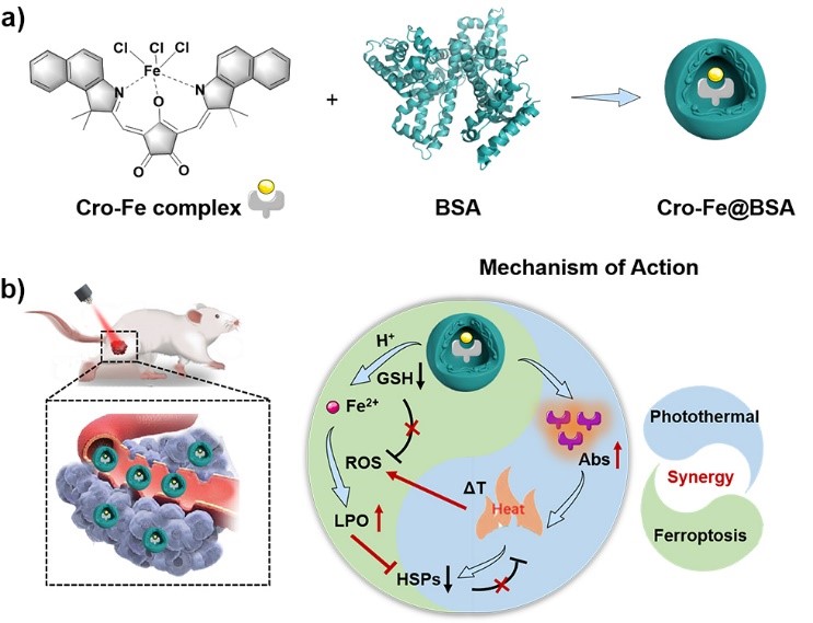 图1基于“互惠型”协同增强机制的纳米诊疗平台。(a)克酮酸(Cro)与铁离子(Fe3+)配位并与白蛋白结合形成Cro-Fe@BSA纳米颗粒;(b)Cro-Fe@BSA纳米颗粒在肿瘤微酸和还原性环境(H+/GSH)中引发铁死亡过程,通过抑制HSP70的表达增强Cro的光热治疗效率,同时光热引起的温度效应提升Fenton反应的效率,通过“互惠型”机制协同增强肿瘤杀伤效果。