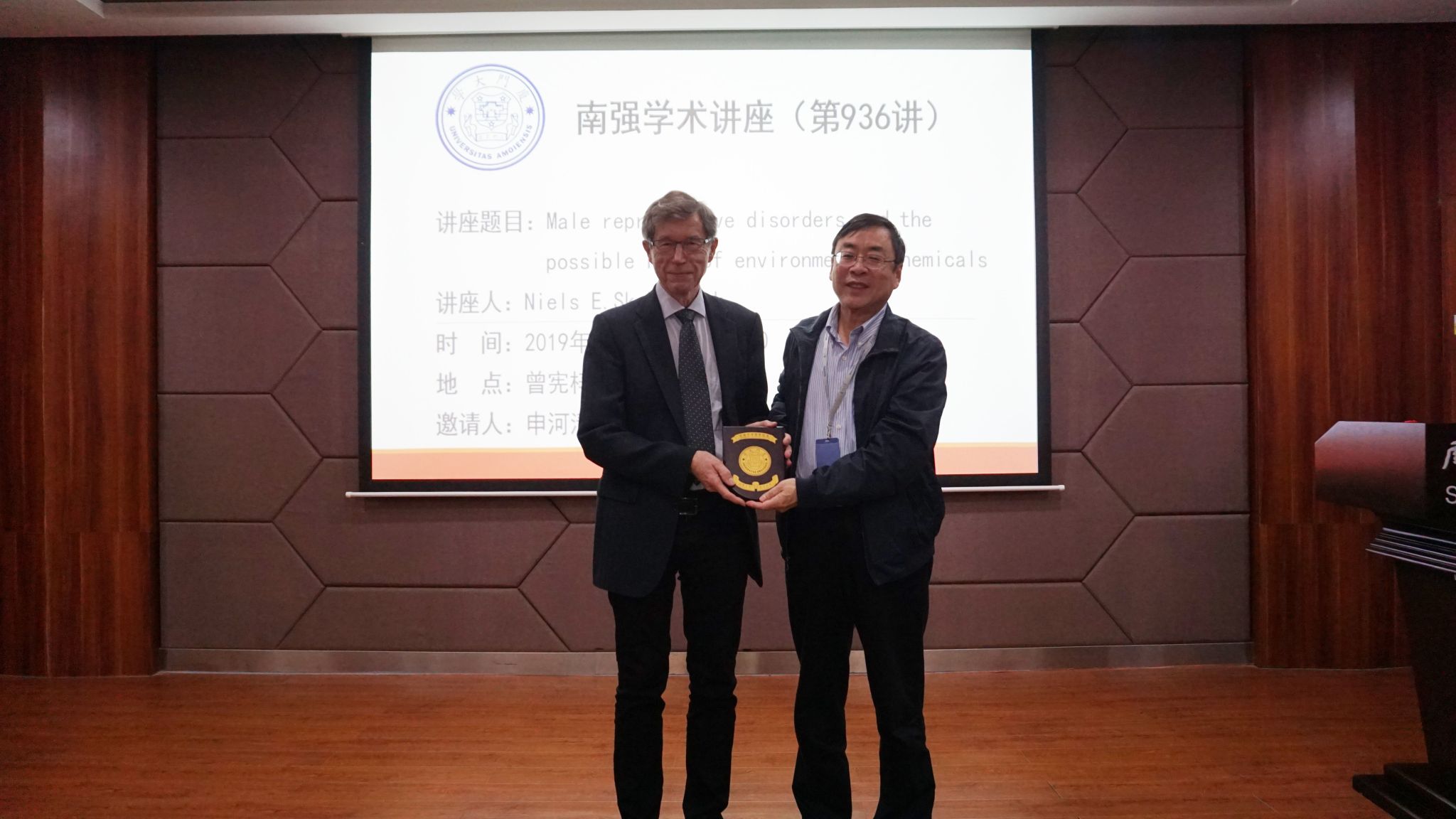 讲座伊始,学院副院长赵勤俭教授为Niels E. Skakkebaek教授颁发南强纪念牌并合影留念。