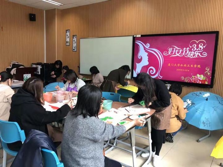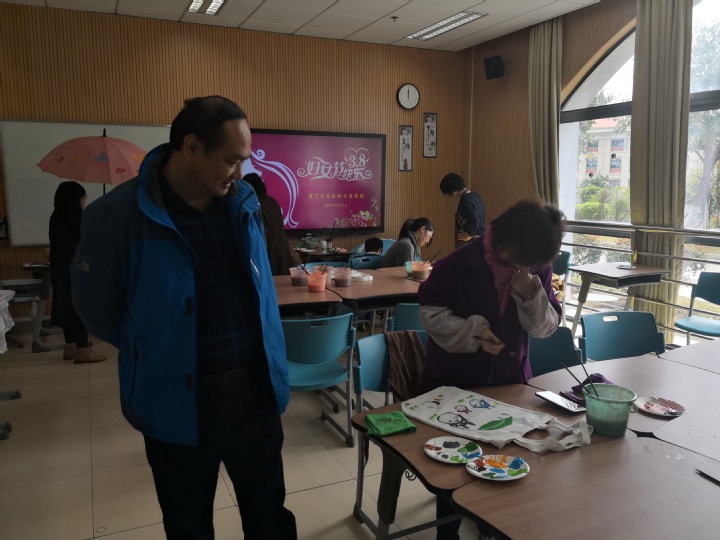 活动伊始,学院工会主席王颖彬老师为广大女教职工送上节日祝福,充分肯定了女教工在学院各方面发展和活动中的积极作用。在一片欢声笑语中大家在专业老师的指导下分别开始了扎染围巾、手绘布袋、手绘雨伞等艺术创作。活动过程中,大家对这次特别的艺术课堂表现出了浓厚的兴趣,并认真地根据现场老师的讲解进行专注有序的创作。在大家的努力下,一条条个性十足的围巾、一把把精致的雨伞、一个个秀美的布袋呈现在大家的眼前,大家互相欣赏着自己的作品并互相分享。精彩的活动也得到了张琥书记的肯定,并指出多组织此类活动,丰富老师们的业余生活。