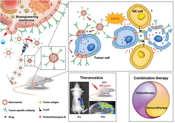 基于上述工作基础,团队设计了一种表面展示全长抗体的纳米级细胞膜囊泡(Vesicular antibodies,VAs),通过将肝癌特异性膜蛋白GPC3和卵巢癌特异性膜蛋白Claudin4的全长抗体分别利用基因工程技术表达展示在细胞膜囊泡上,装载造影剂后,成功实现了活体肿瘤模型中高特异性肿瘤多模态成像。最重要的是,VAs在特异性递送药物进行化疗的同时,还可调节免疫系统,在肿瘤部位高效募集并活化NK细胞,启动ADCC(antibody-dependent cell-mediated cytotoxicity,抗体依赖的细胞介导的细胞毒性作用)杀伤肿瘤细胞,通过化疗与免疫协同疗法彻底清除肿瘤。该策略相较于单纯的联合使用化学疗法与免疫疗法,能够更为有效地控制恶性肿瘤进展。这种基于基因工程的囊泡化抗体技术,为抗体药物及诊疗一体化探针的研发建立了新的方法,为实现化学疗法与免疫疗法的协同治疗提供了新的思路。