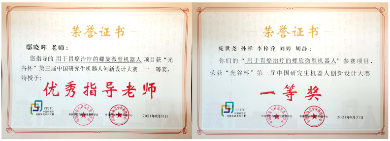 2021年8月24-25日,“光谷杯”第三届中国研究生机器人创新设计大赛全国总决赛在线上举行。经过激烈角逐,我院鄢晓晖老师指导的医用微纳米机器人团队(成员为庞世尧、孙祥、李梓乔、刘婷、胡静)凭借参赛作品“用于胃癌治疗的螺旋微型机器人”从全国762支队伍中脱颖而出,斩获大赛一等奖(一等奖共14个)。