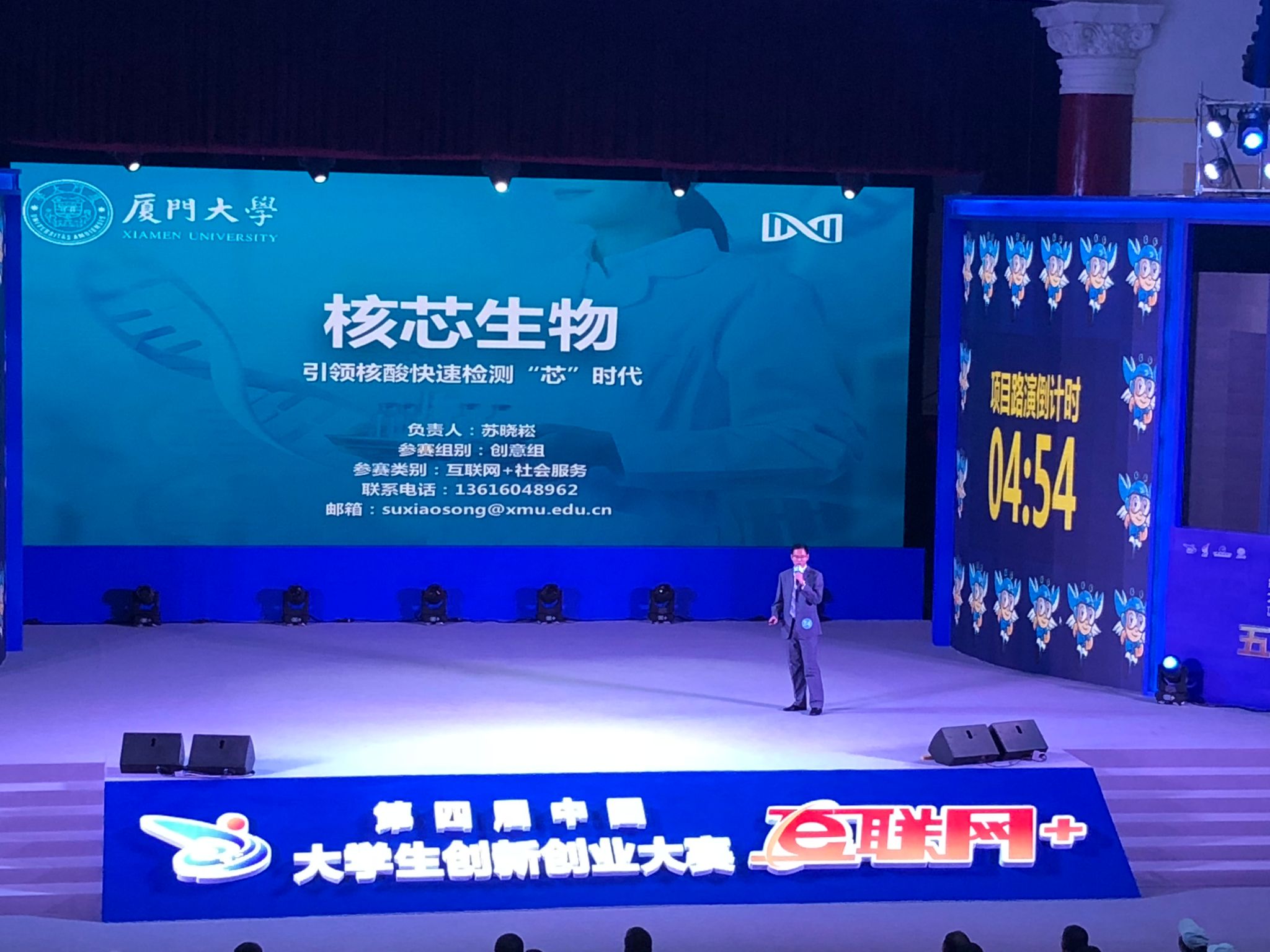10月13日-15日,为期三天的第四届中国“互联网 +”大学生创新创业大赛总决赛在厦门大学思明校区隆重举行。我院“核芯生物”团队斩获大赛金奖,创造了我院在大学生创新创业竞赛中的最好成绩。本次大赛共有64万支团队参加比赛,进入金奖争夺赛的共有290支,其中包含中国大陆(150支)和台港澳(20支)参赛队170支,“青年红色筑梦之旅”赛道60支,国际赛道参赛队60支。