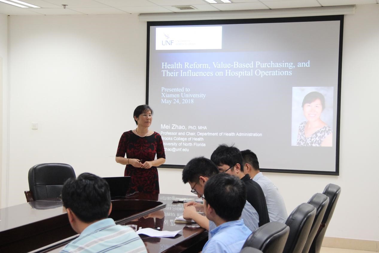 5月24日上午,应我院方亚教授邀请,美国北佛罗里达大学布鲁克斯卫生学院卫生管理系主任赵梅教授来访我院。访问期间,赵梅教授作了题为 “Health Reform, Value-based-Purchasing, and Their Influences on Hospital Operations”的学术讲座,讲座由方亚教授主持,我院卫生经济与政策研究中心的全体师生参加了本次讲座。
