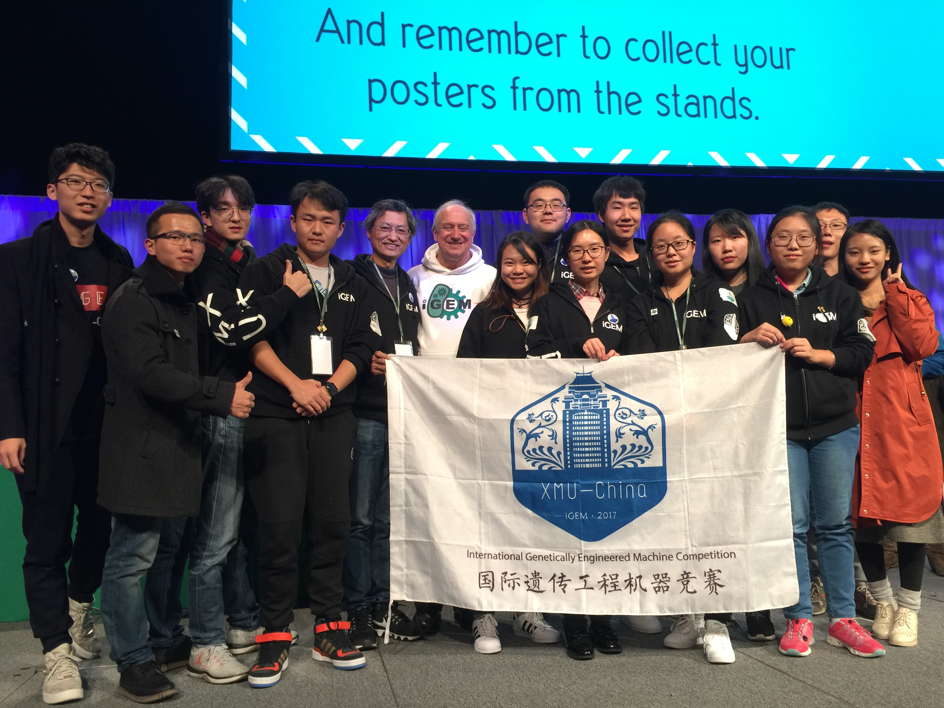 今年11月9日至11月13日在美国波士顿举办的GIANT JAMBOREE,全球有来自38个国家共计336支高校队伍参赛,包括了哈佛、斯坦福、剑桥、牛津、MIT等世界一流高校,以及北大清华为首的国内顶尖高校。厦门大学2017-iGEM团队的全体成员经过不懈努力,再次斩获金奖!