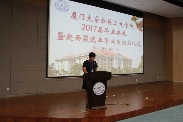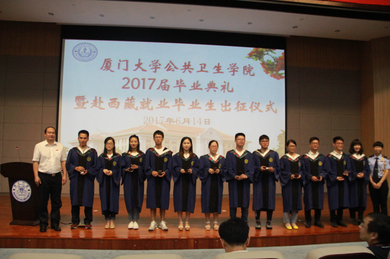 6月14日下午,公共卫生学院2017届毕业典礼暨赴西藏就业毕业生出征仪式在翔安校区德旺图书馆二号报告厅举行。校长助理滕伯刚教授、公共卫生学院党政领导及2017届全体毕业生及部分学生家长参加了典礼。典礼由党委副书记黄兆君主持。