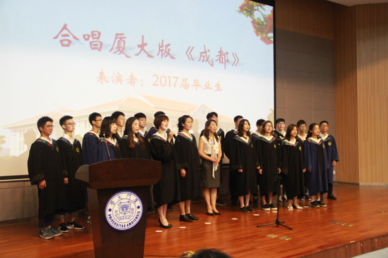 毕业生代表发言结束后,2017届毕业生依次上台,接受学院赠予的刻有自己名字的毕业戒指,这枚戒指不仅具有深刻的纪念意义,还象征着一种身份的跨越,更象征着母校精神的延续与发扬。在赠予毕业戒指环节中,毕业生们还一展歌喉,表演了如厦大版《成都》等曲目,用青春嗓音唱响对旧日时光的不舍与怀念,为在场师生奉献了一场精彩的视听盛宴。