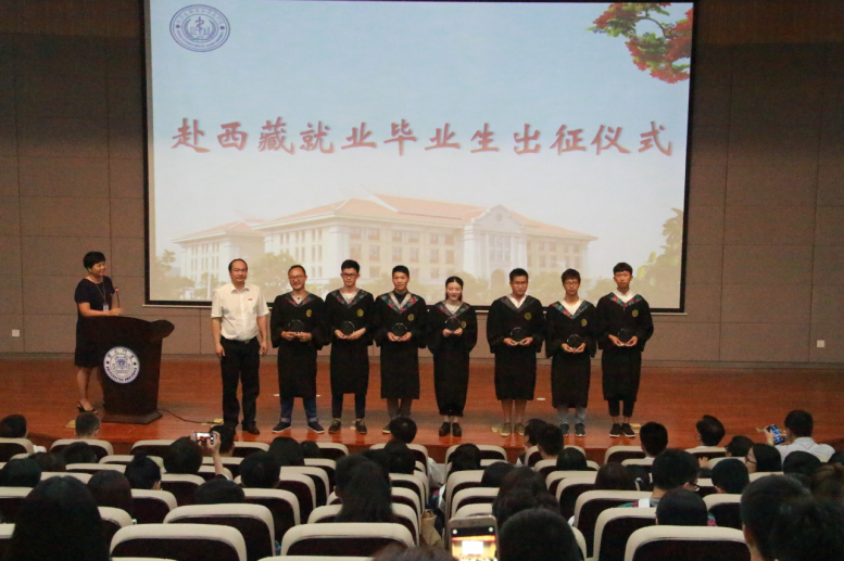 在随后的欢送赴西藏就业毕业生出征仪式上。张琥书记代表学院向即将赴西藏地区工作的七位同学赠送了镌刻有“追逐梦想,青春飞扬”的纪念水晶,希望他们可以一路追逐着自己的梦想,让青春无限飞扬。