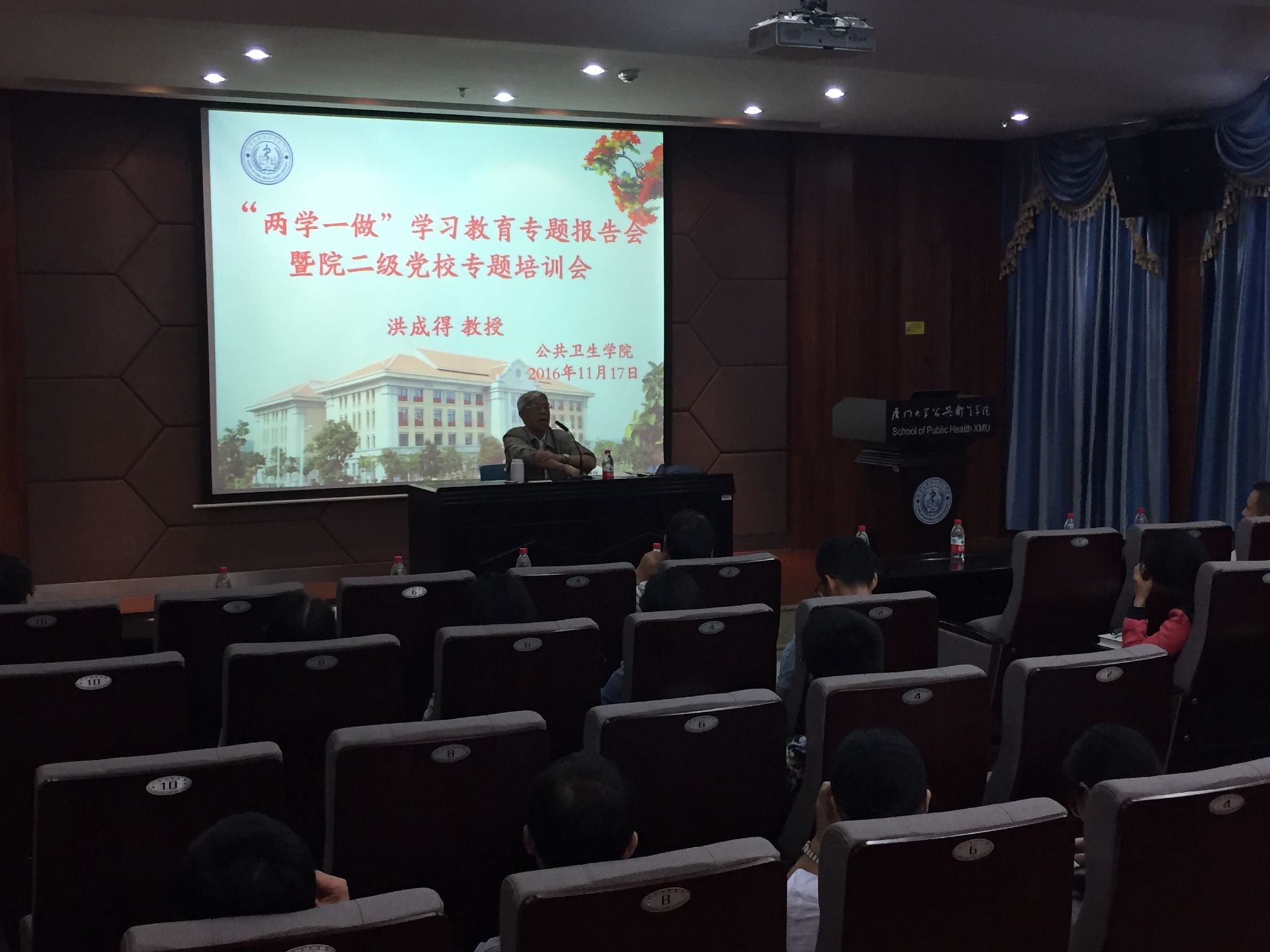 11月17日下午,校资深理论报告员洪成得教授应邀在曾宪梓楼101报告厅为我院师生党员作题为《从十八届六中全会精神解读习近平谈治国理政》“两学一做”学习教育专题报告。报告会由院党委副书记黄兆君主持。张琥书记、张军副院长、杨机像副书记等院领导,师生党员、入党积极分子参加了报告会。