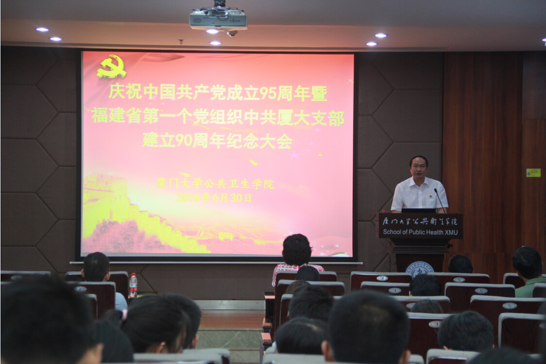 6月30日中午,公共卫生学院庆祝中国共产党成立95周年暨福建省第一个党组织中共厦大支部建立90周年纪念大会在曾宪梓楼101报告厅召开。学院党委书记张琥在讲话中,回顾党的光辉历程,重温厦门大学爱国革命的光荣传统,并结合当前开展的“两学一做”学习教育,对进一步加强学院党建工作及推动学院事业发展做了梳理和安排。大会还表彰了学院先进党支部、优秀党员和优秀党务工作者;组织过去一年光荣加入党组织的新党员面向党旗庄严宣誓,承诺志愿为党的事业奋斗终身。