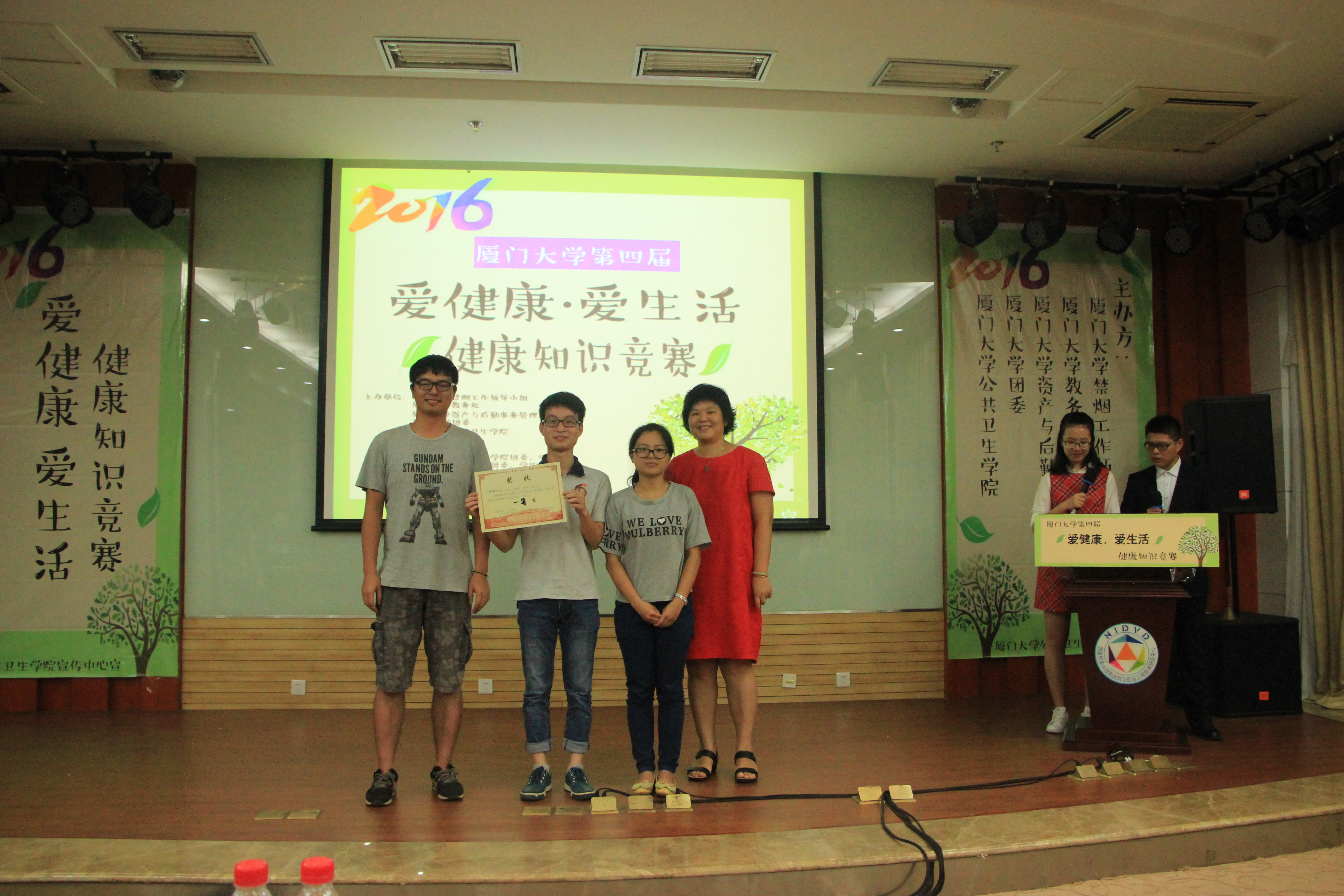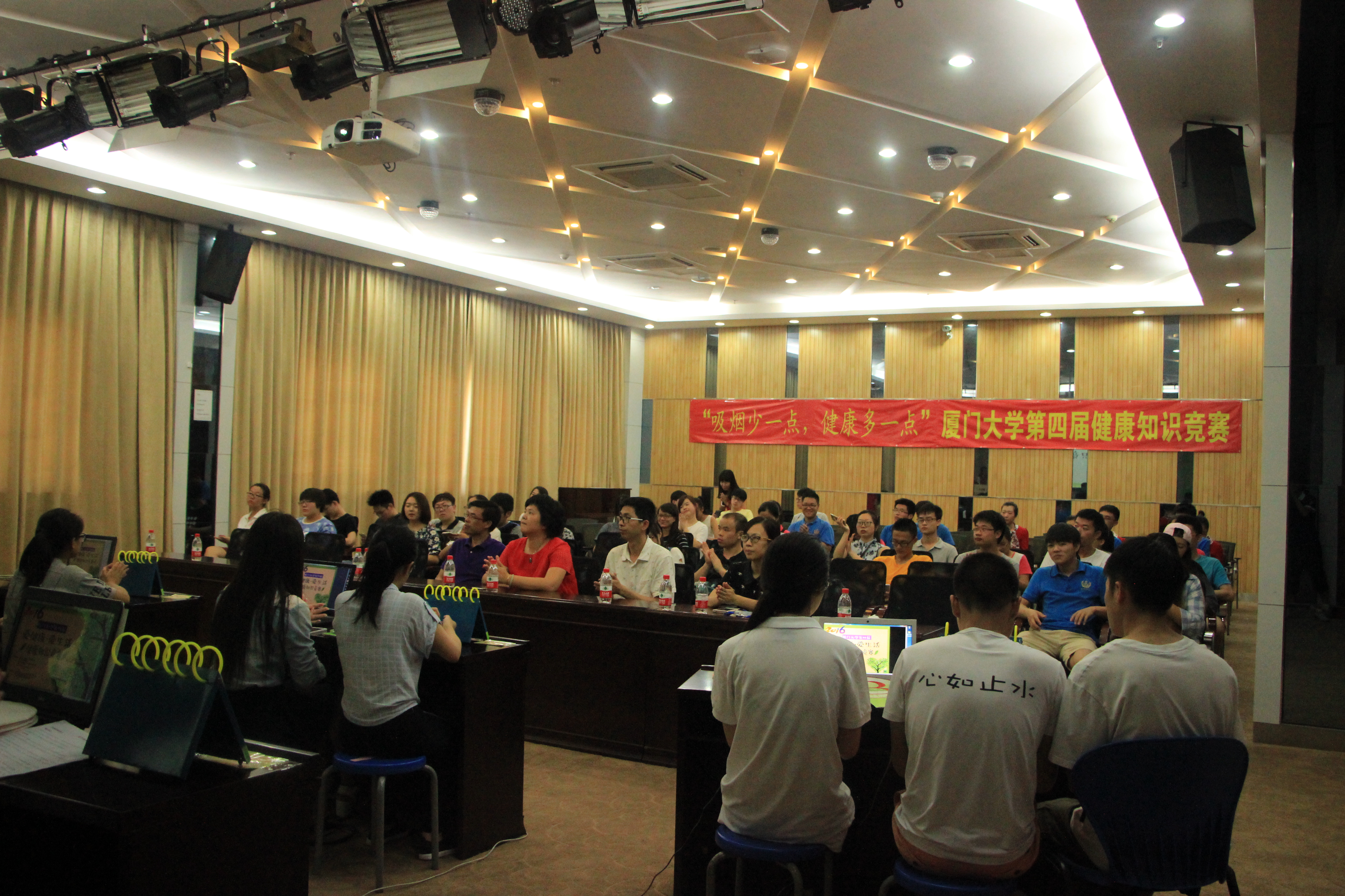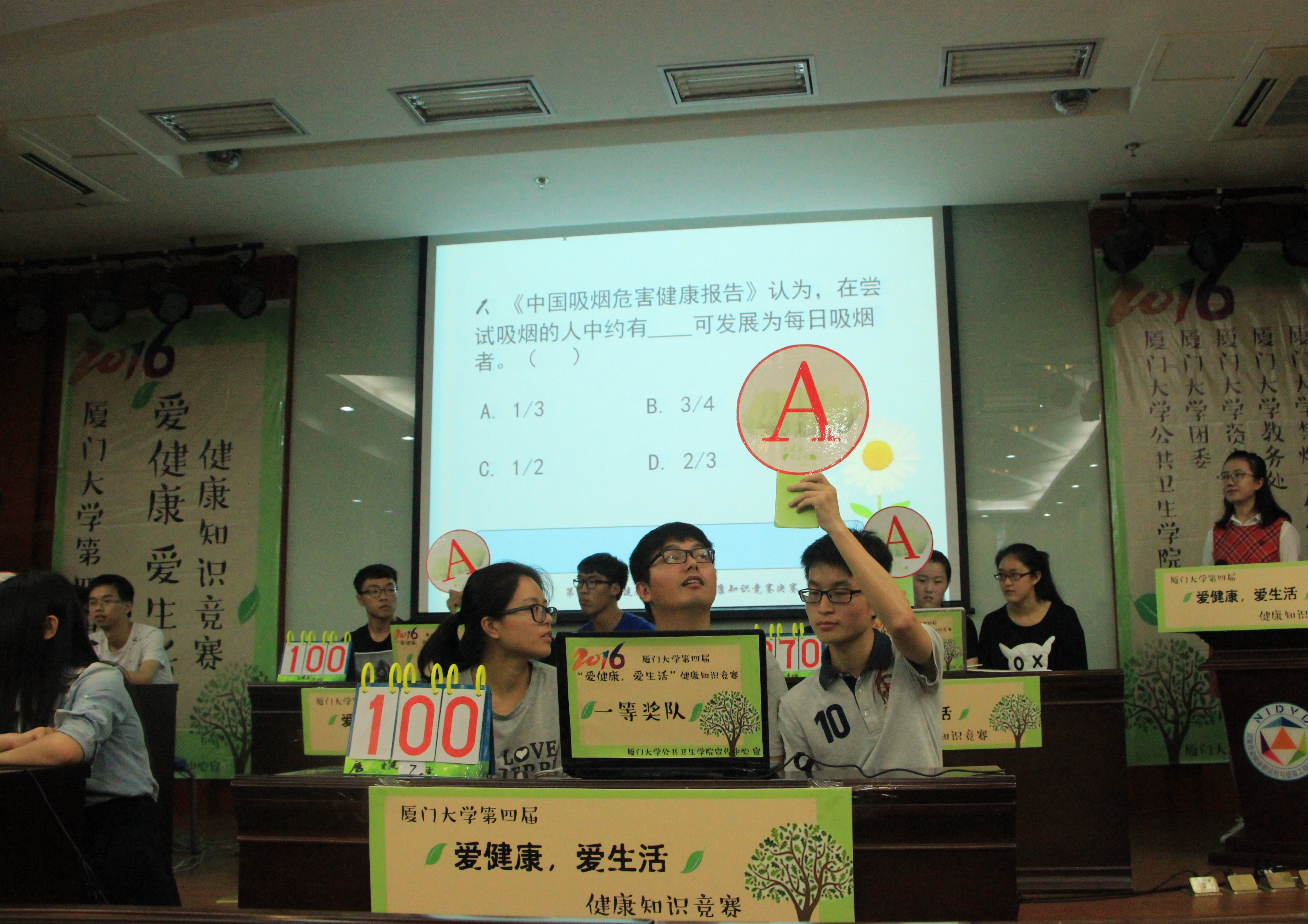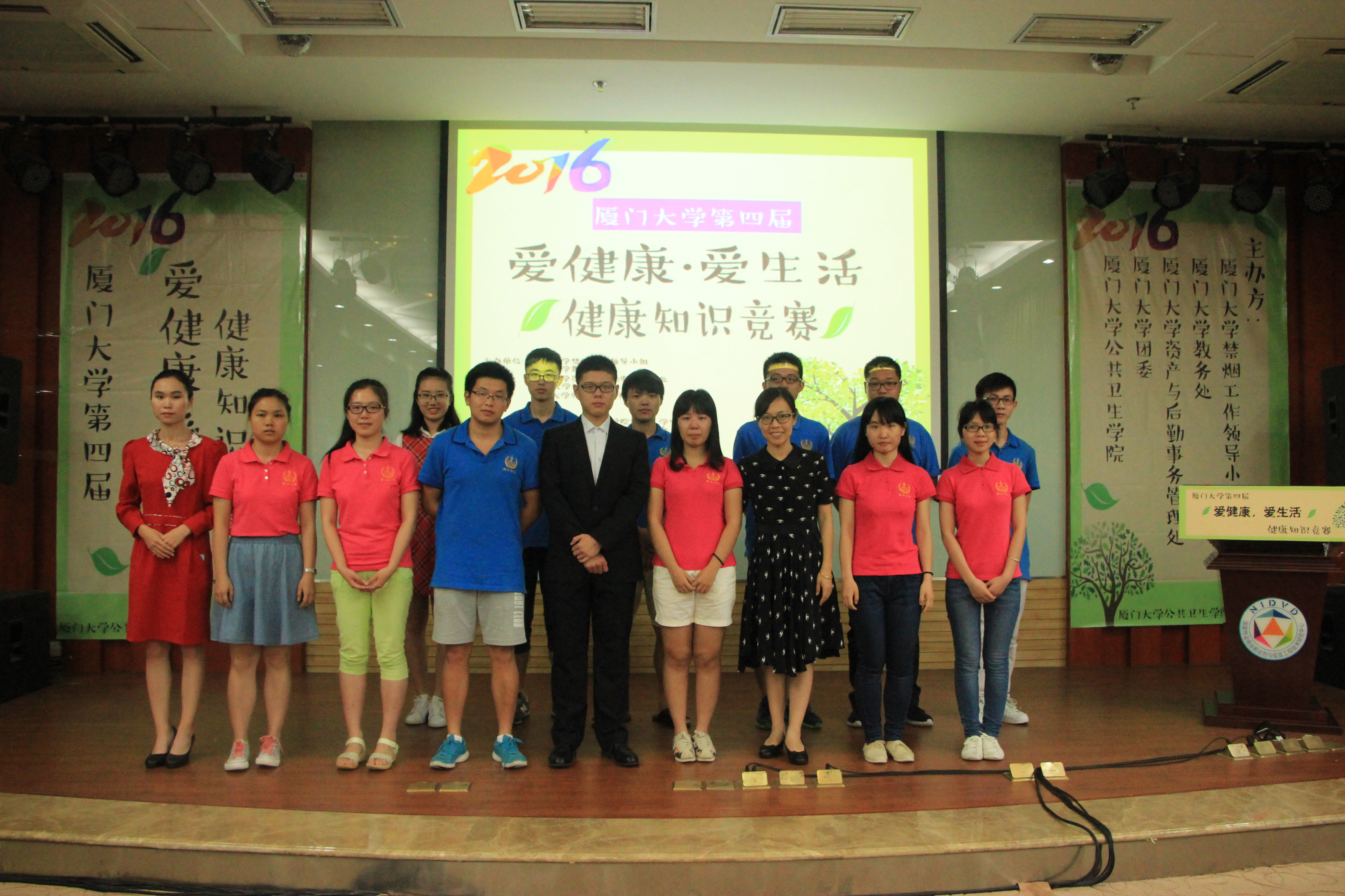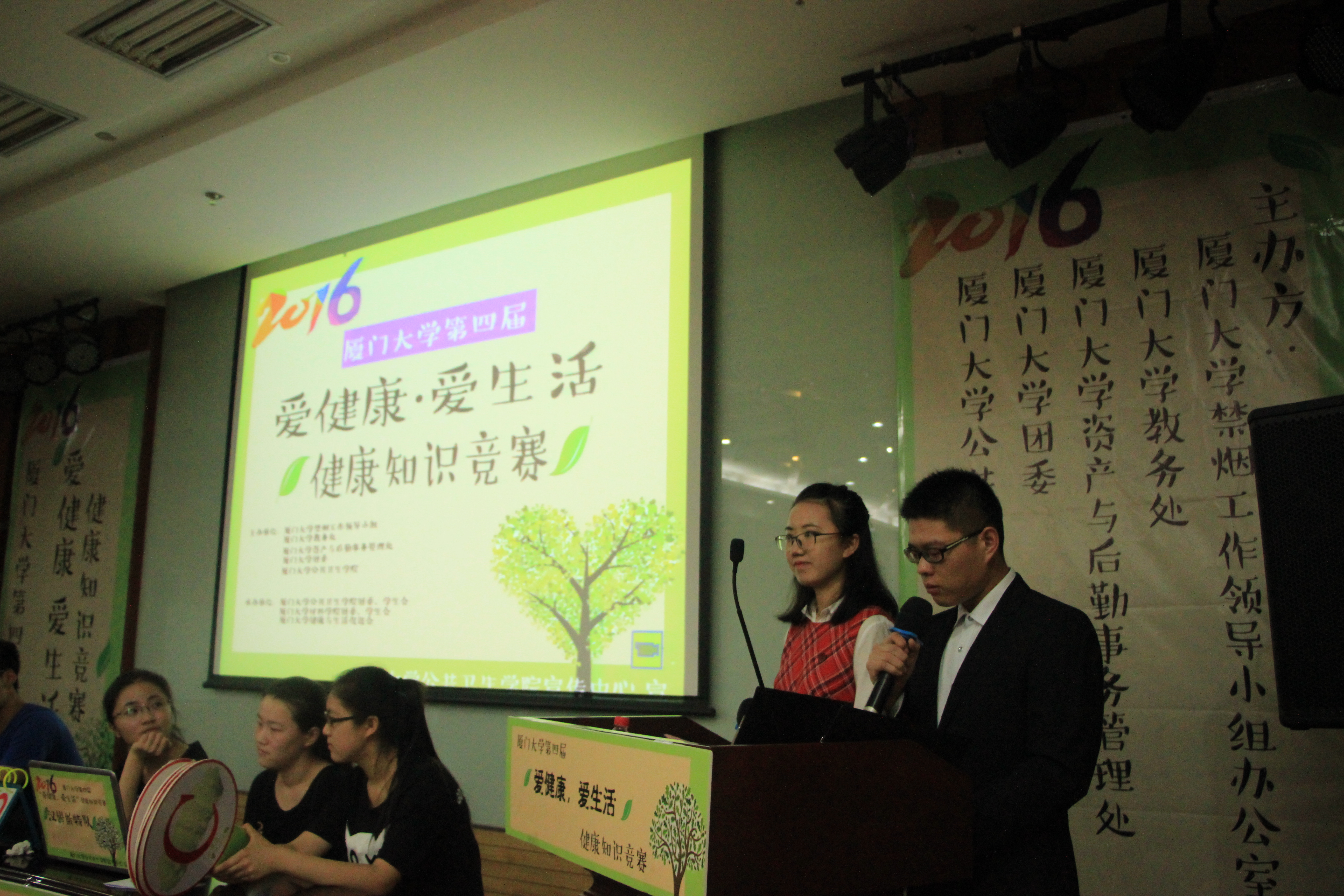 2016年5月28日,由厦门大学禁烟工作领导小组办公室、资产与后勤事务管理处、教务处、校团委、公共卫生学院共同主办的厦门大学第四届“爱健康,爱生活”健康知识竞赛决赛于椭圆楼四楼会议室如期举行。出席决赛现场的嘉宾有公共卫生学院党委副书记黄兆君老师,资产与后勤事务管理处杨卫国副科长,材料学院团委书记杜超老师, 公共卫生学院团委书记黄佳佳老师。进入决赛的队伍有化学化工学院的迷之小分队,公共卫生学院的一等奖队与奇思妙想队,人文学院的健康1队,环境与生态学院的汉姆斯特队,能源学院的采薇队,材料学院的交电费队。决赛现场由公共卫生学院马心蕊和吴国平主持。
