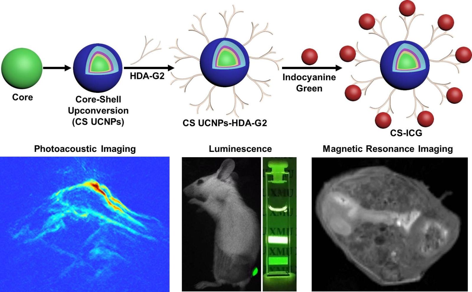 本研究合成了800nm激发的多壳上转换荧光纳米颗粒,在近红外光激发下具有生物组织穿透深、对生物组织无损伤、近乎零背景荧光干扰、成像灵敏度高等诸多优点,同时Gd掺杂的壳结构的设计不仅大大提高了其量子产率,也使该粒子具备了MRI成像的能力,与980nm激光相比,800nm激光不仅可以避免过热效应,而且其荧光强度提高了10倍以上,组织穿透深度能够达到62.5px。随后,本研究将ICG-NHS偶联在UCNPs表面(CS2–ICG),实现光声、荧光和磁共振三模态成像。独特的设计使得PAI和UCL信号强度均明显提高,从而能够提供更多的细节信息,如深部的微血管和肿瘤边界。本研究合成的多模态影像策略有望用于肿瘤的早期诊断、药代动力学研究及手术导航等。