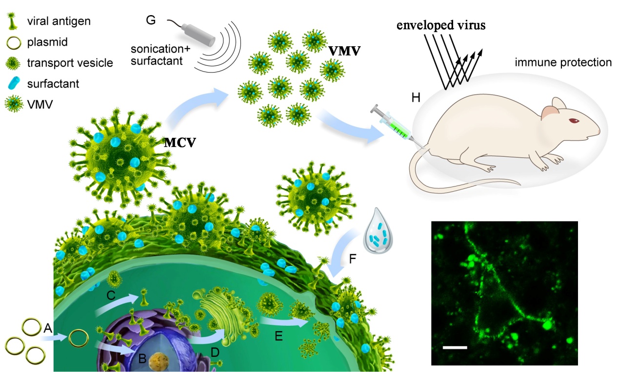 该成果通过在细胞膜表面进行蛋白抗原的结构改造和表面活化剂的嵌入,创制了一种新型的尺寸可控并能展示多种病毒包膜多肽和蛋白的纳米囊泡。该纳米载体在后续实验中证明不仅在尺寸、形态以及重要的免疫原性上成功模拟了天然的流感病毒,而且可以有效的在小鼠体内诱导抗病毒的中和抗体,表明了拟态病毒纳米囊泡作为普适性的抗原投递系统在快速应对包膜病毒疾病方面的巨大潜力。