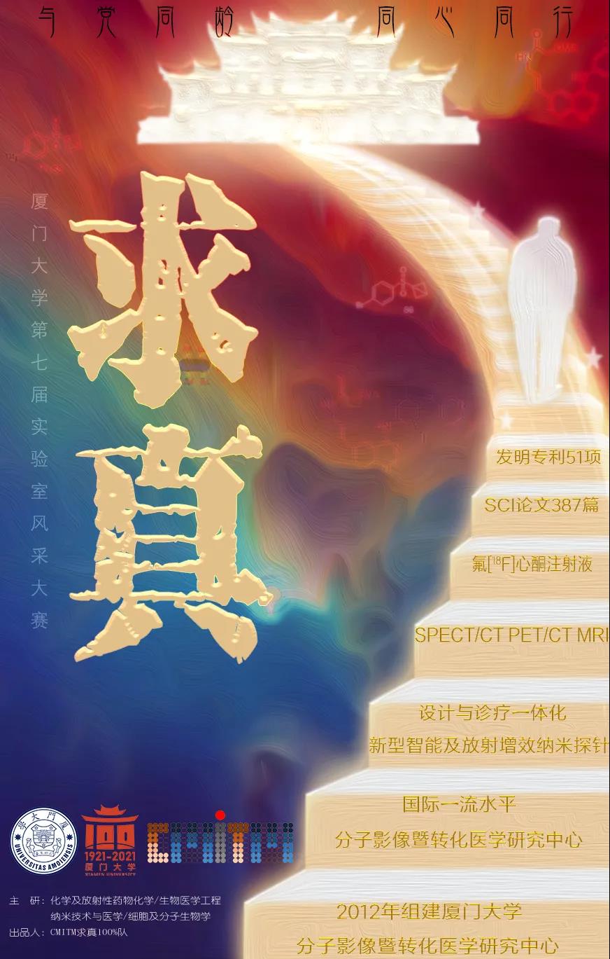 本次大赛共分为风采海报展示、实验技能比拼、特色展示与才艺表演三个环节。在海报展示环节中,CMITM&求真100%队以“厦大蓝”和“嘉庚红”为基调,“求真”为主题,“与党同龄,同心同行”为口号,创作出极具特色的团队海报。逐级向上的台阶上细数了公共卫生学院分子影像中心的发展历程和傲人的学术成果,代表着学子勇攀科研高峰,争创更多荣誉的决心,最终摘得大赛“海报人气奖”。