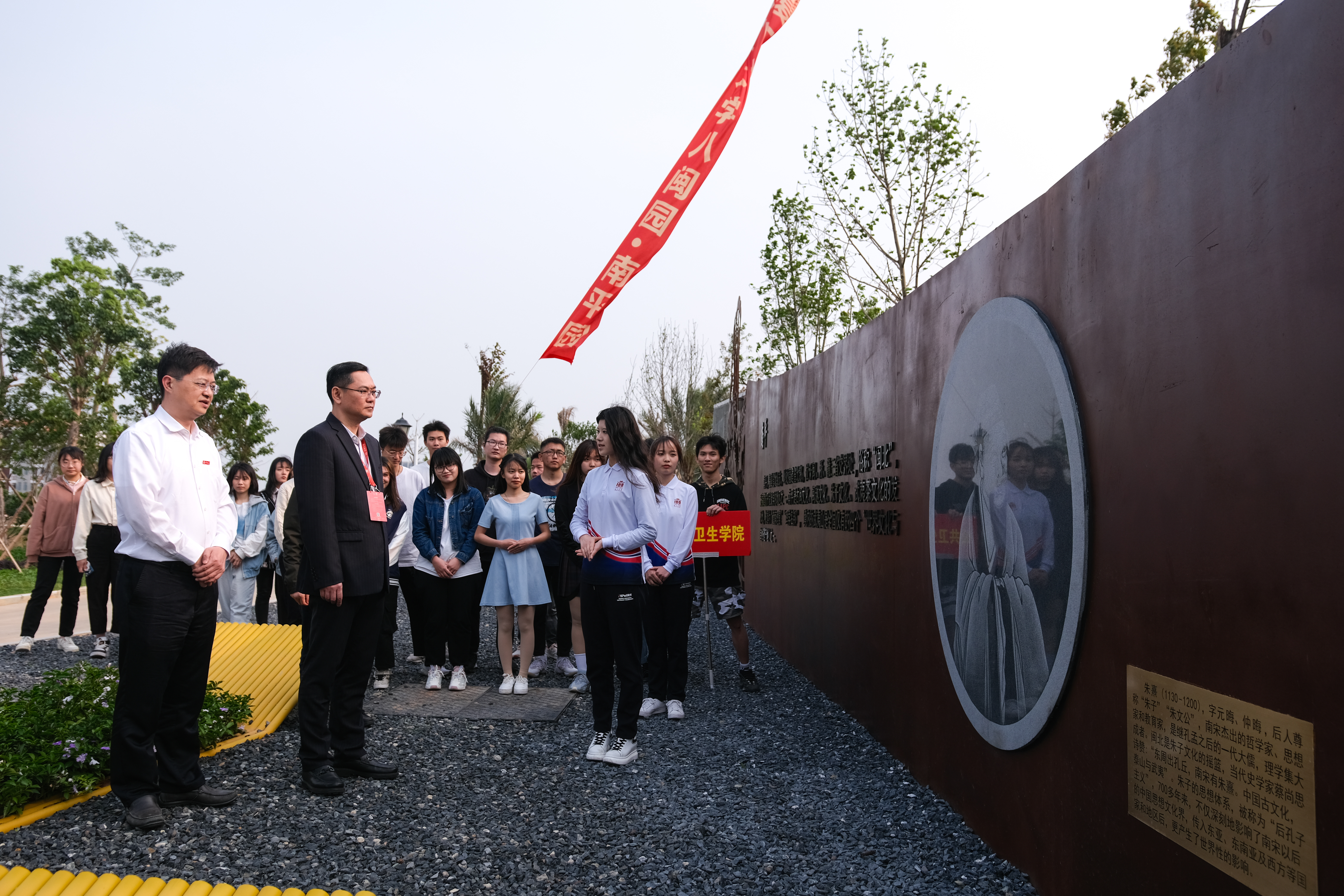 丘毅参观了南平园,详细了解南平园的设计理念和文化背景墙,并对志愿者讲解员和我院师生的精心筹备给予充分肯定。