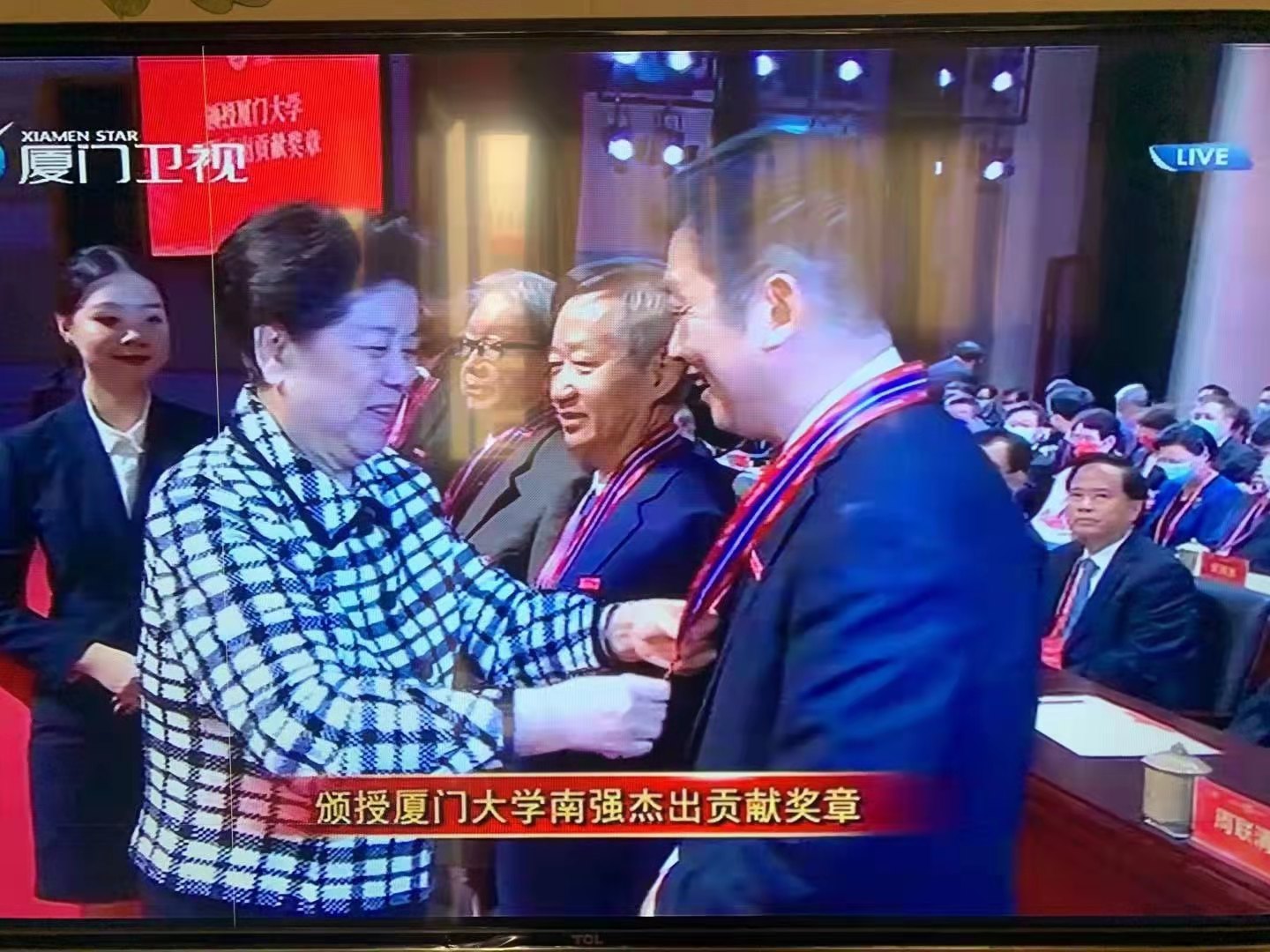 南强杰出贡献奖是厦门大学授予教师的最高荣誉,用以奖励为学校建设和发展作出巨大贡献的优秀教师,迄今为止已连续颁发9届,共有28位厦大教师获此殊荣。在全场热烈的掌声中,陈至立为田昭武、黄本立、陈孔立、吴宣恭、林祖赓、洪华生、张亦春、吴伯僖、潘维廉、赵玉芬、郑学檬、夏宁邵、郑兰荪、田中群等14位获奖代表颁授“厦门大学南强杰出贡献奖章”。