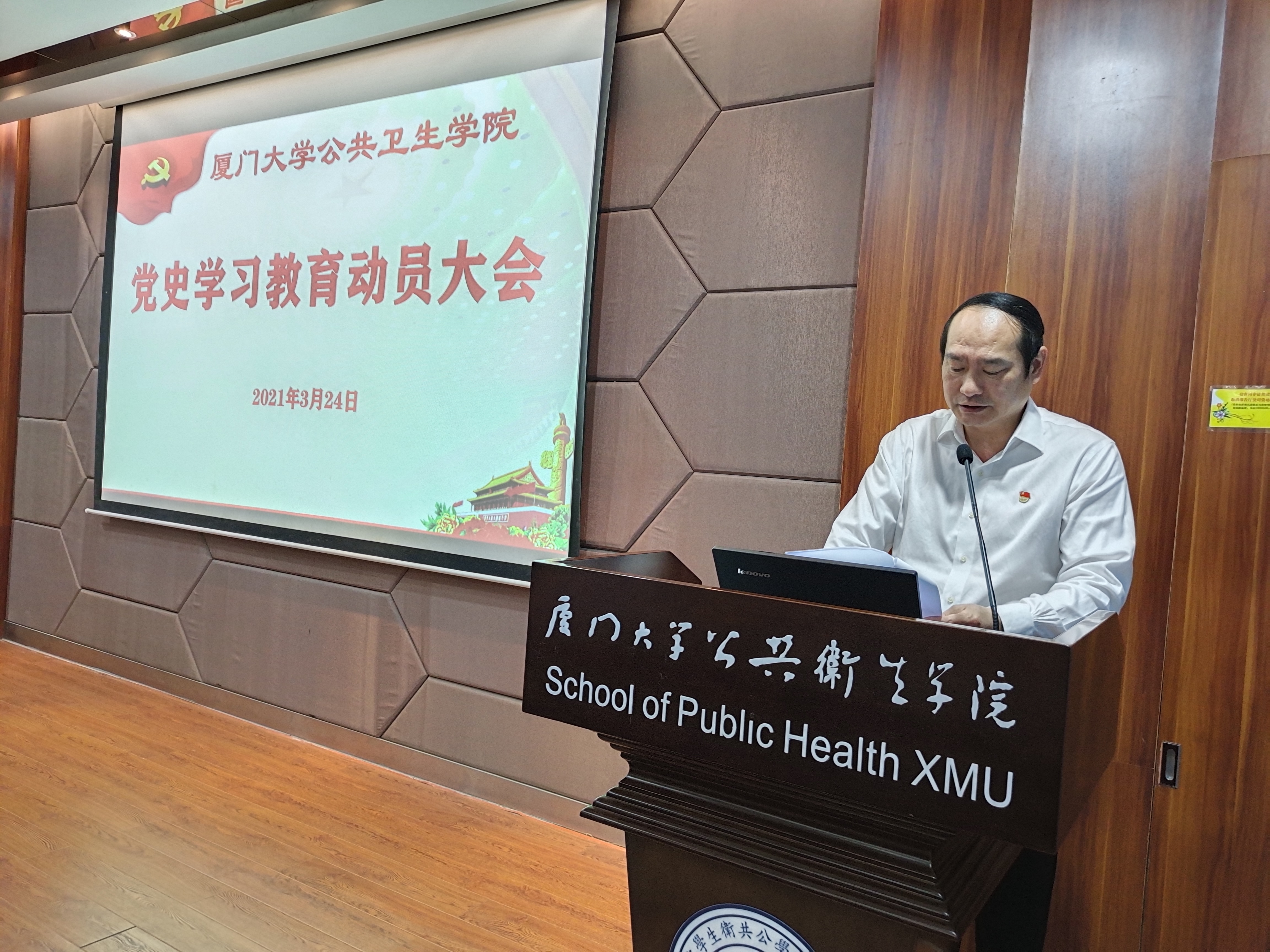 学院党委书记张琥作动员讲话。张琥传达了校党委书记张彦在学校党史学习教育动员大会上的讲话精神。他强调,开展党史学习教育是当前一项重要政治任务,要提高站位,统一思想,深刻认识在建党一百周年之际开展党史学习教育的重要意义;要加强领导,务求实效,精心组织主题突出、特色鲜明、形式多样的学习活动,贯彻落实好学校党史学习教育各项工作要求。他表示,厦大公卫人始终与党同心同行,秉持“为党育人、为国育才”的初心使命,为我国公共卫生教育事业和人才培养发挥积极作用。在建党百年和建校百年历史交汇的关键节点,立足新起点、新征程,守正创新,实干担当,坚持学史明理、学史增信、学史崇德、学史力行,将党史学习教育与建设高水平公共卫生学院目标相统一,扎实推进学院各项工作高质量发展,以实际成效体现学习教育效果,为支持“健康中国”发展战略实施和学校“双一流”建设作出厦大公卫人应有之贡献。