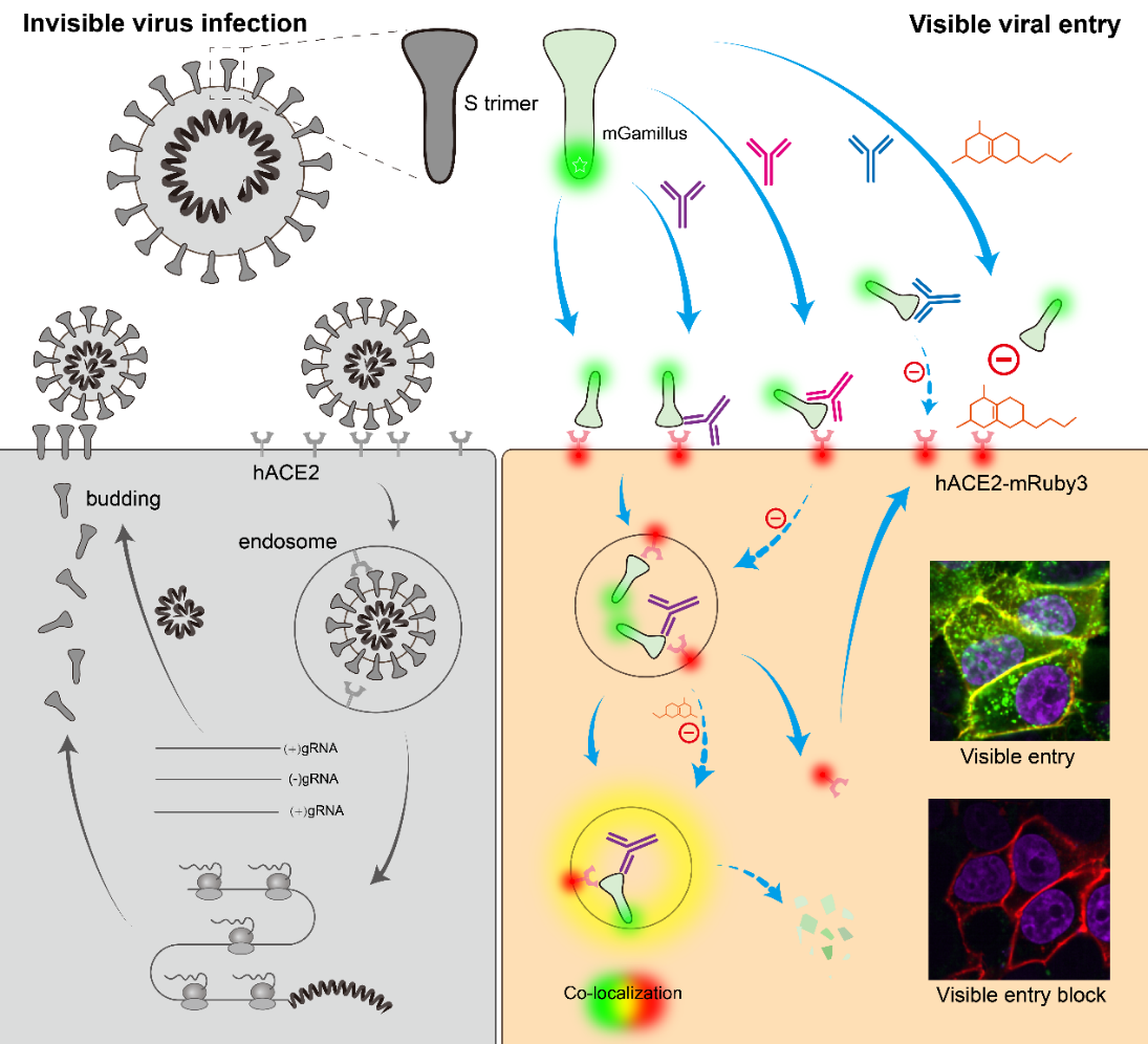 新型冠状病毒SARS-CoV-2在全球蔓延,给全球公共卫生带来严重威胁。快速研制疫苗、抗体和治疗药物成为科学界面临的重大挑战。由于SARS-CoV-2的高度传染性,采用病毒感染模型进行中和抗体及小分子抑制剂的药效评估需要在高等级生物安全实验室中进行,且常需要数天时间才能完成检测,限制了抗体和药物筛选的效率。发展快速、可视、不依赖于活病毒的新冠病毒入胞检测探针和细胞模型,对于加速新冠病毒抗体和药物的研究有重要意义。
