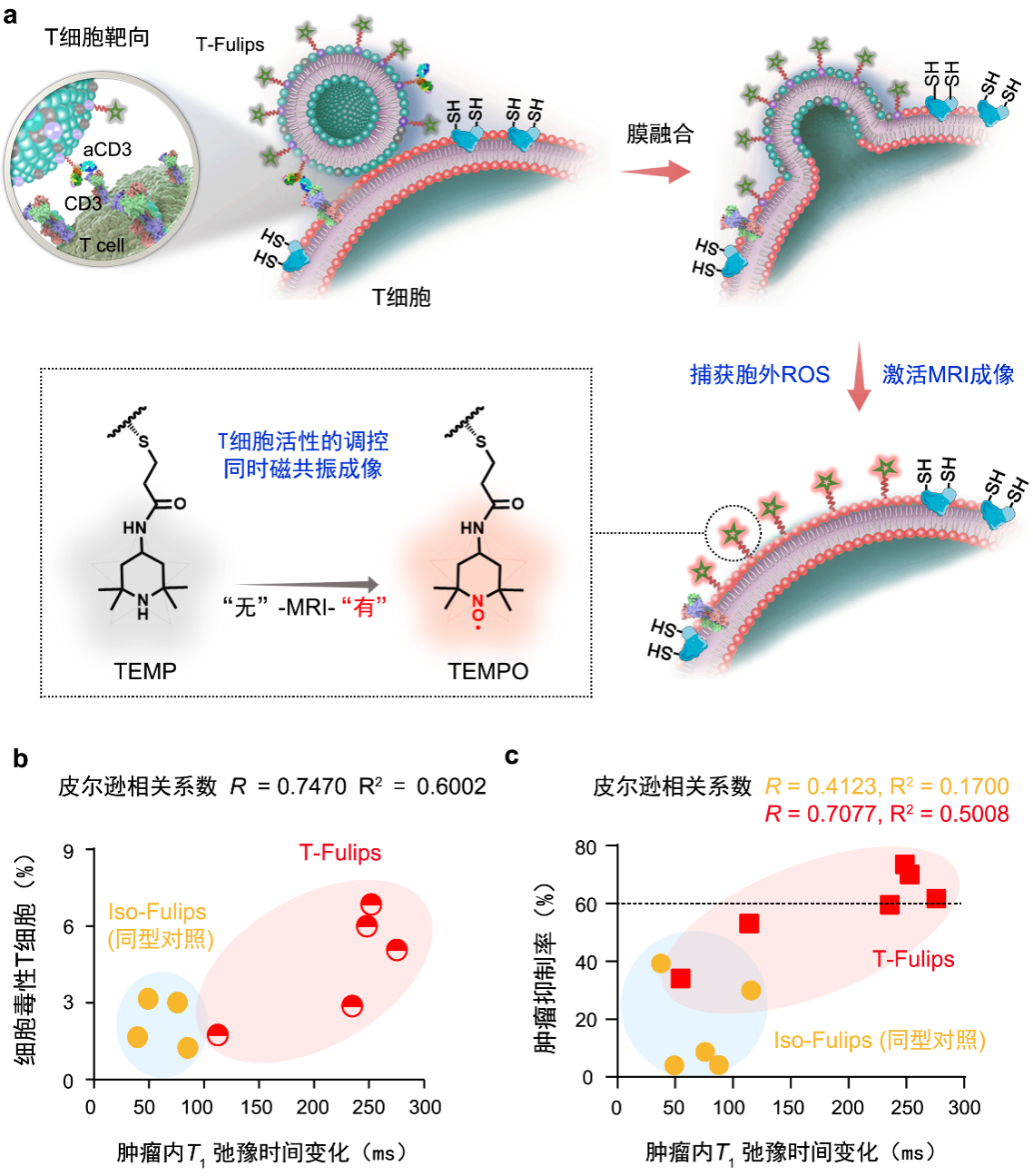 针对活性氧环境中T细胞衰竭而失去免疫活性的关键科学问题,我们构建了一种T细胞靶向的膜融合脂质体,T-Fulips(图1)。它与T细胞靶向膜融合后,将一种经典的活性氧捕获剂2,2,6,6-四甲基哌啶(TEMP)分子展示到T细胞的表面,捕获T细胞膜表面的活性氧,从而提升T细胞在活性氧环境中的免疫活性。同时,TEMP分子本身由逆磁性被氧化为顺磁性的TEMPO,激活磁共振成像,实现了T细胞免疫活性的可视化调控。