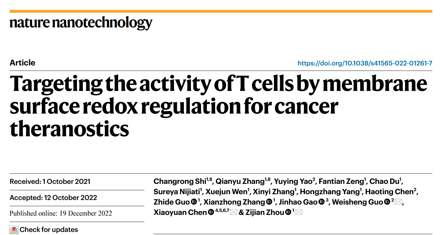 近日, 我院分子影像中心周子健老师课题组与新加坡国立大学陈小元教授和广州医科大学郭伟圣教授合作在国际顶级学术期刊Nature Nanotechnology上发表了题为“Targeting the activity of T cells by membrane surface redox regulation for cancer theranostics”的研究论文。该研究针对T细胞在活性氧微环境中发生免疫活性耗竭的关键科学问题,首次利用化学生物学手段靶向捕获T细胞膜表面活性氧,实现了T细胞免疫活性的在体可视化调控。