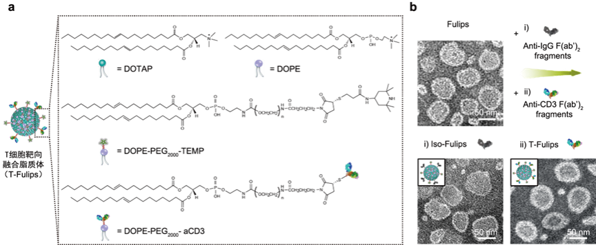 图1:(a)T-Fulips组分及结构示意图;(b)T-Fulips及同型对照Iso-Fulips透射电镜图